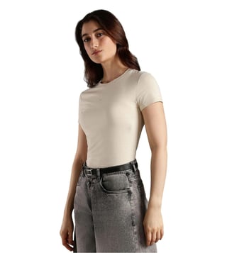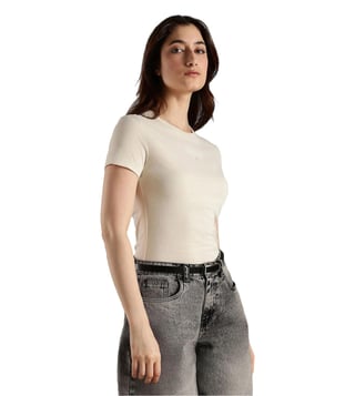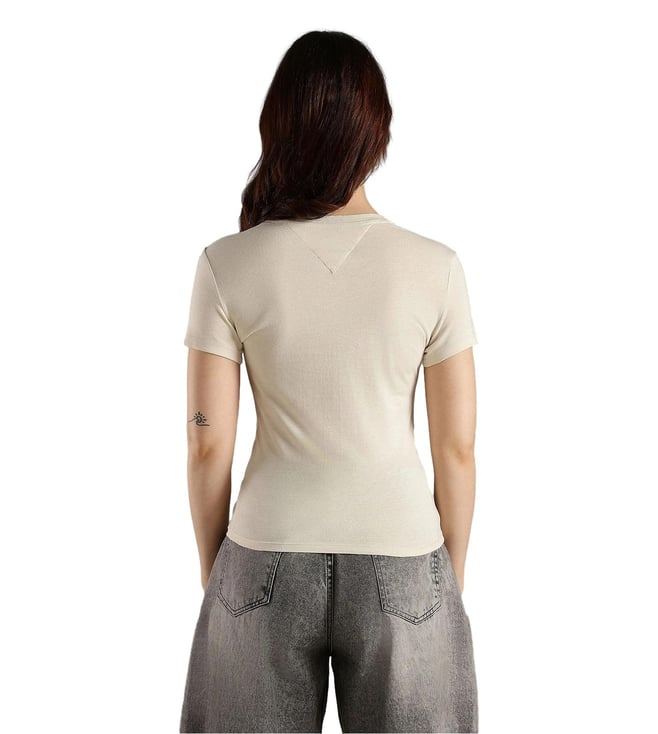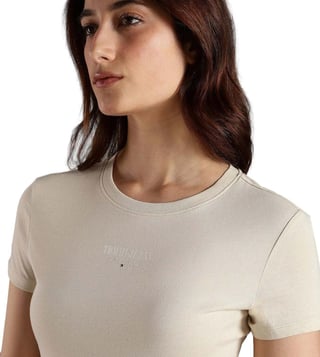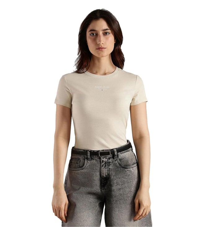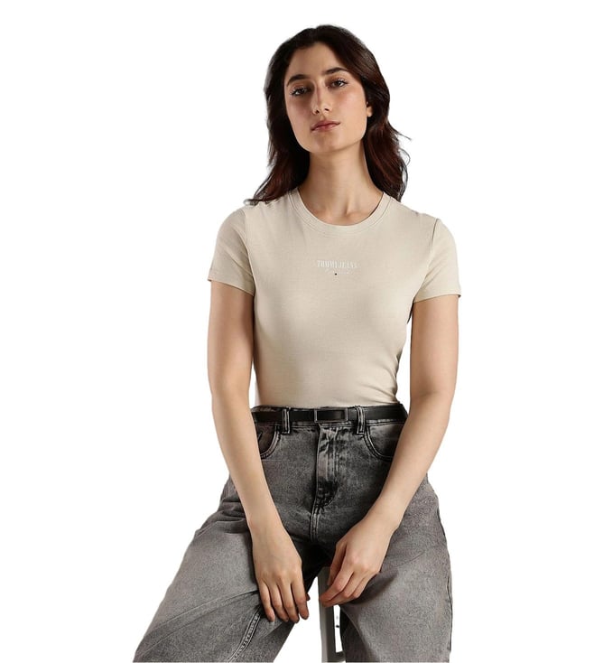 TOMMY HILFIGER Beige Cotton Slim Fit Logo Printed T-Shirt