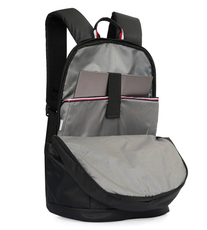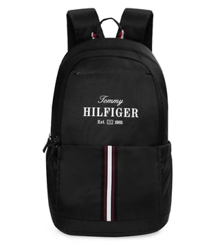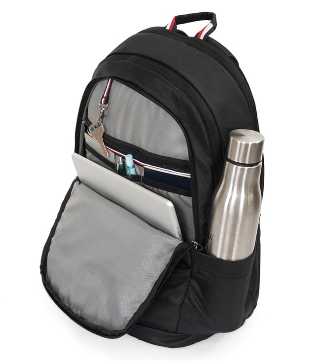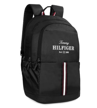 Elevate your everyday carry with the TOMMY HILFIGER elbert laptop backpack in a sleek black color. This bag is the ultimate fusion of advanced functionality and iconic style. It features a spacious three-compartment design with a generous 31-liter capacity, including a dedicated padded sleeve for a 15-inch laptop. An included branded rain cover ensures your belongings stay protected in all weather conditions. The bag is thoughtfully designed with a multi-utility organizer and a metal key holder, while the back trolley holder provides seamless travel convenience.