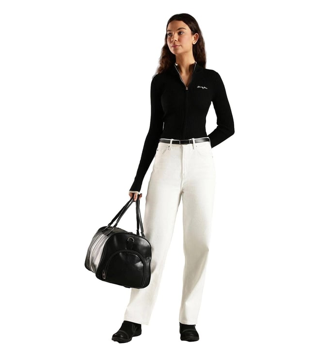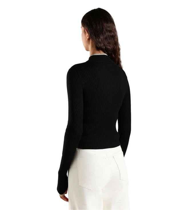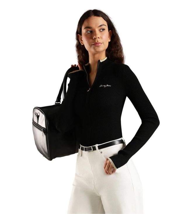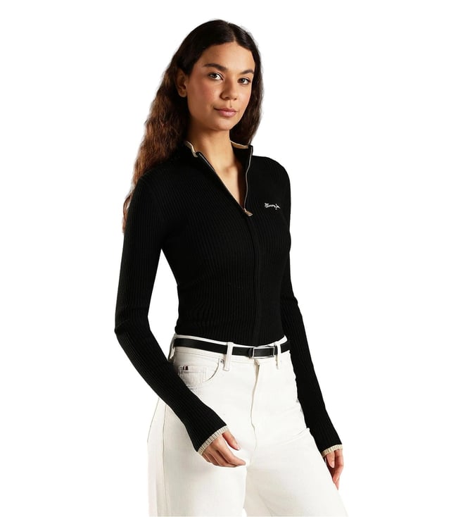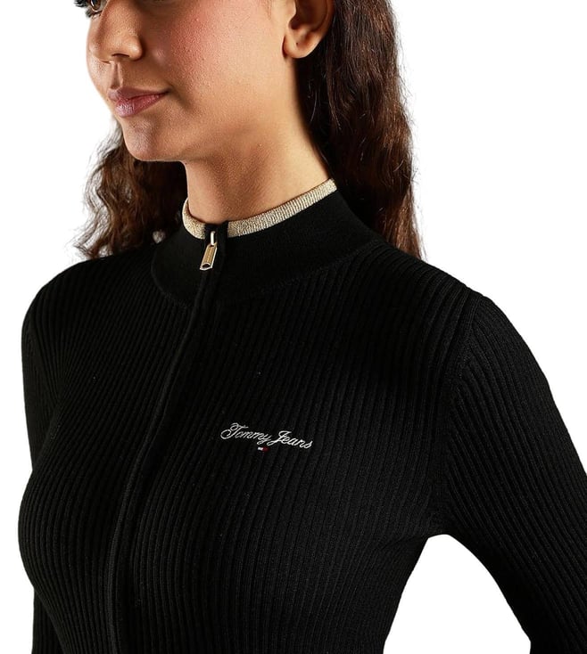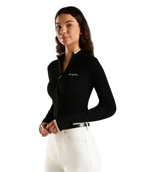 TOMMY HILFIGER Black Slim Fit Polyester Mock Neck Front-Open Sweater