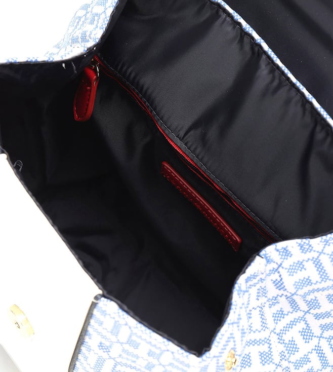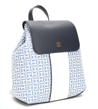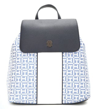 Unleash your ultra-modern side with this women backpack from TOMMY HILFIGER. It features a snap closure and a logo pattern for added attraction. Exuding an urbane feel, it is detailed with 2 compartments and 2 pockets to accommodate daily essentials in a safe manner. Made of premium quality jacquard for durability, this blue backpack has a adjustable strap for carrying comfort.