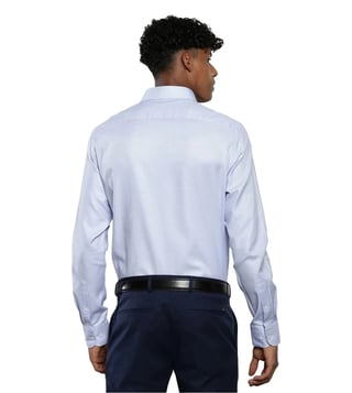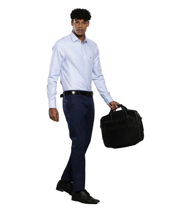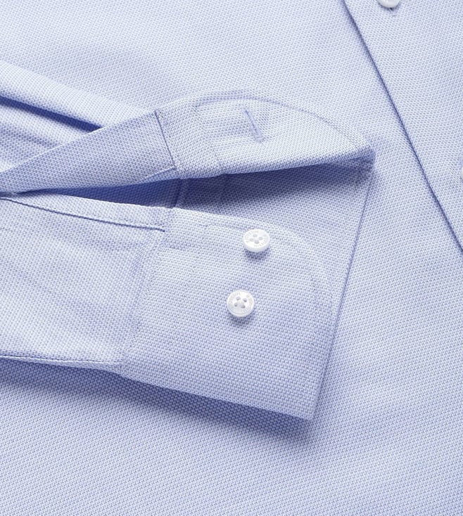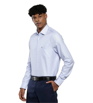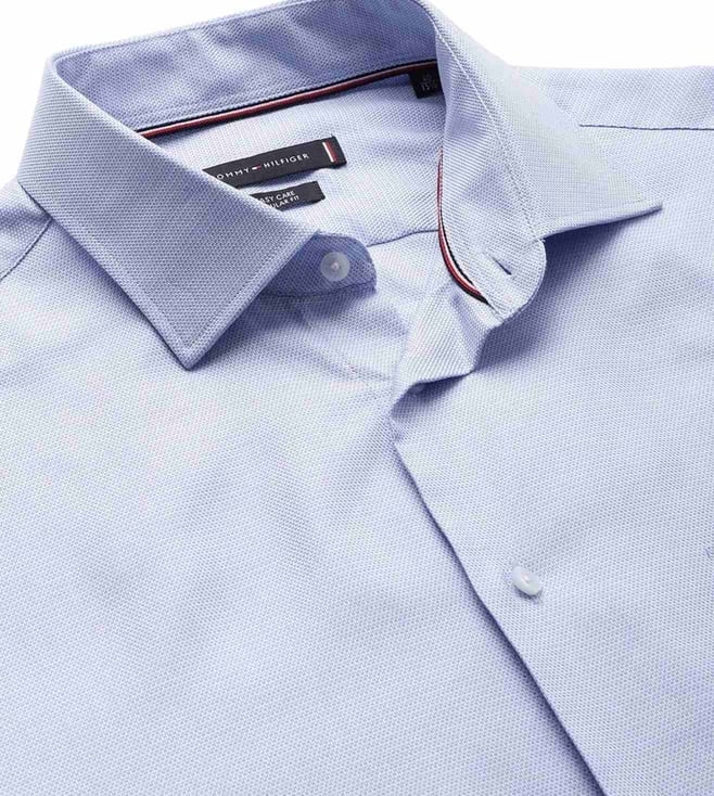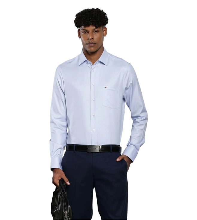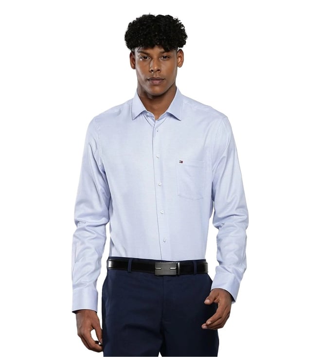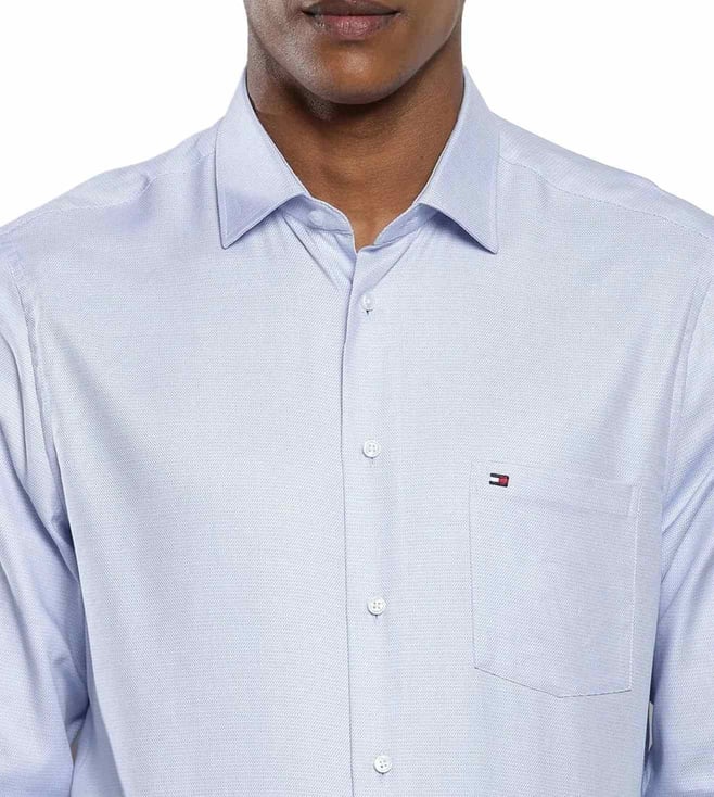 Amplify your overall charm by donning this blue regular fit shirt from TOMMY HILFIGER, that will add a dash of extra charm to your look. Tailored to sartorial perfection from premium quality fabric, it assures a soft and soothing touch against the skin. The shirt collar adds to its appeal. Exuding full sleeves, it is sure to fetch you compliments from all. The structured pattern makes it a bewitching choice.