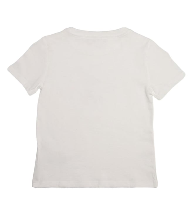 Give your boy's wardrobe a cool upgrade with this white logo cotton T-shirt. Its regular fit and bold logo pattern make it perfect for casual outings, from playgrounds to family events. Pair with colorful shorts for a fun look.