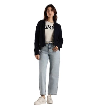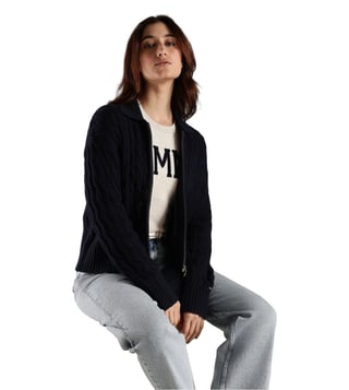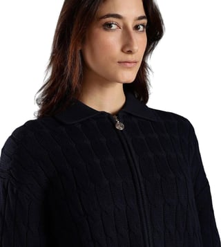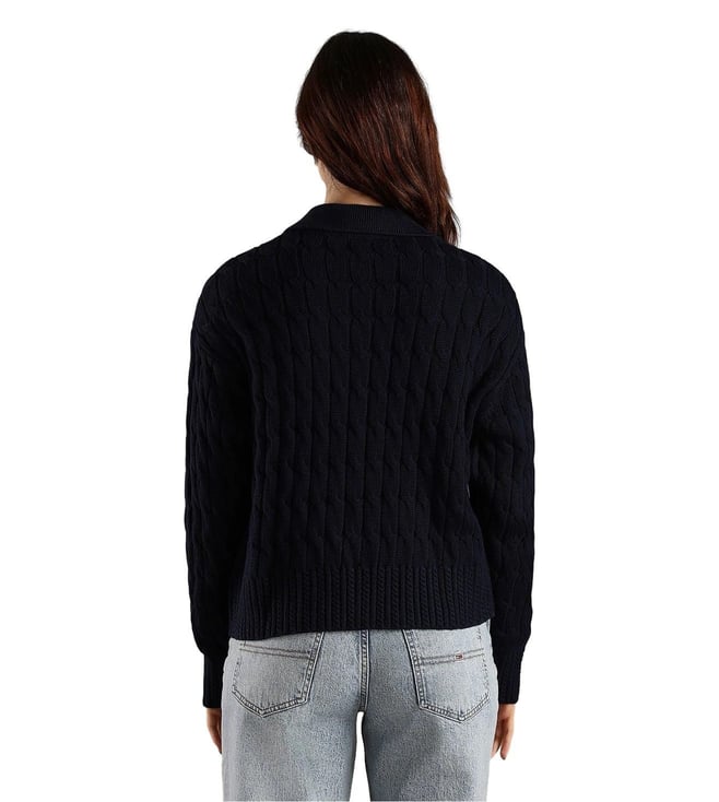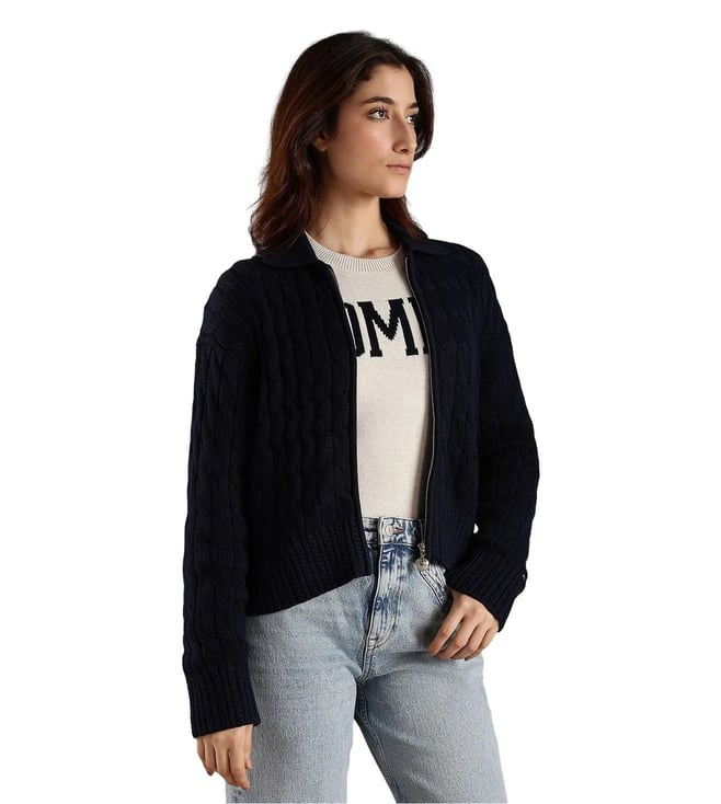 TOMMY HILFIGER Dark Night Navy Relaxed Fit Cotton Polo Collar Front-Open Sweater