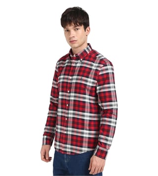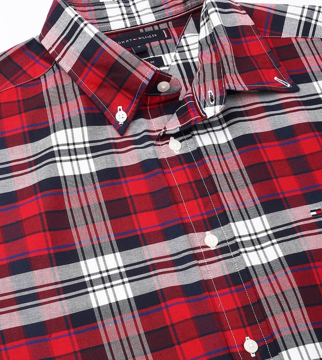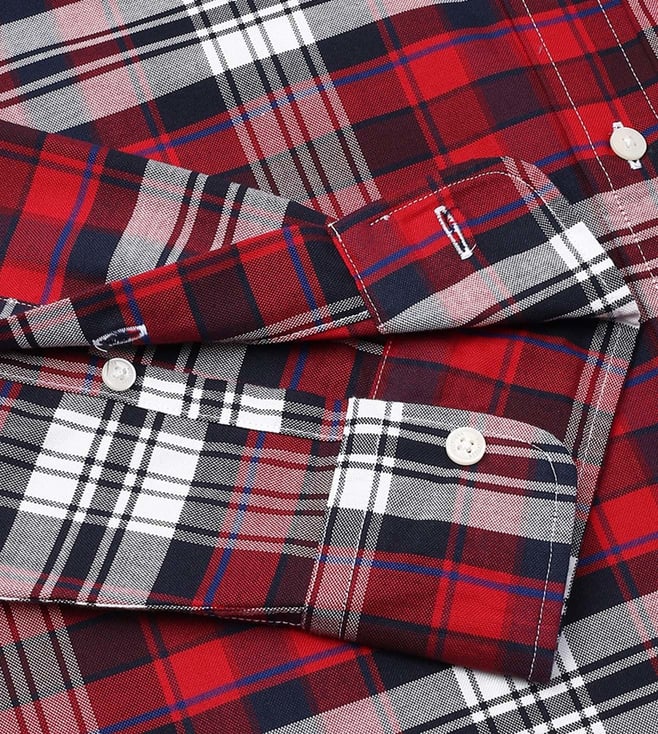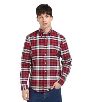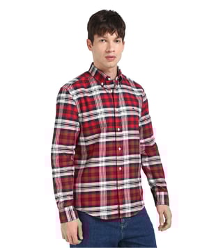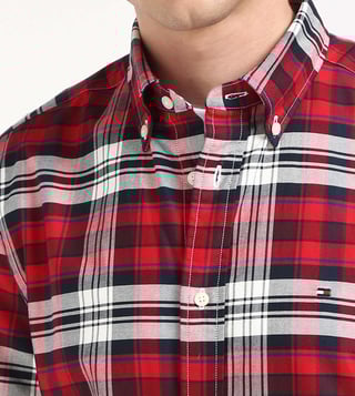 Curate a stunning look by wearing this deep rouge regular fit shirt from TOMMY HILFIGER. Tailored to sartorial perfection from premium quality fabric, it assures a soft and soothing touch against the skin. The shirt collar adds to its appeal. Exuding full sleeves, it is sure to fetch you compliments from all. The chequered pattern lends it a finial touch.