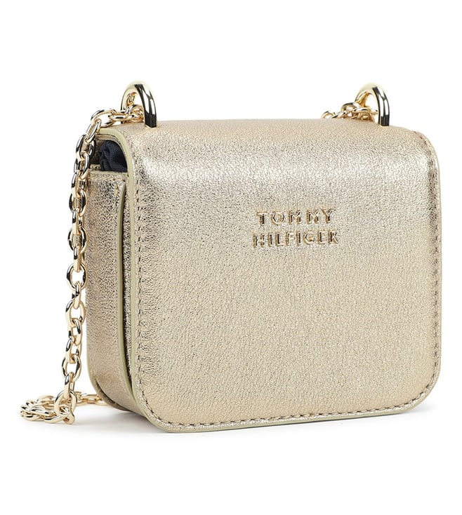 Add zest and zing to your look by carrying this women's cross body bag from TOMMY HILFIGER. It features a twist lock closure for added attraction. Made of premium quality leather for durability, this gold cross body bag has a chain strap for carrying comfort.
