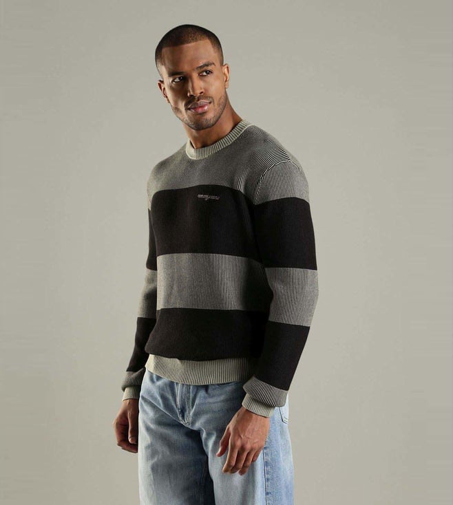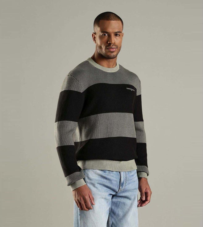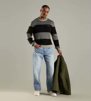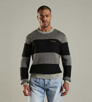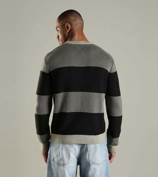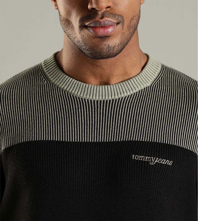Score high on the fashion meter by wearing this green regular fit sweater from TOMMY HILFIGER. Tailored to sartorial perfection from premium quality fabric, it assures a soft and soothing touch against the skin. The round neck adds to its appeal. It emanates a striped pattern which makes it a unique choice.