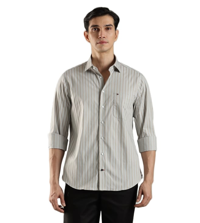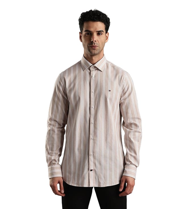 Beige Striped Regular Fit Cotton Shirt