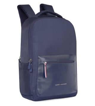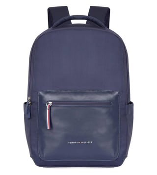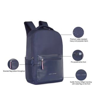 Crafted from a premium water-resistant, heavy-knit polyester fabric, the TOMMY HILFIGER ALTUS PLUS backpack in Navy offers a blend of durability and sophisticated style. The backpack features a clean, two-compartment design, including a dedicated laptop compartment with a mesh backing to provide a comfort zone for your device. A PU pocket at the front, adorned with subtle TOMMY HILFIGER branding and a metal flag, adds a distinctive touch. The interior also includes an organizer with a dog hook and double side bottle pockets for easy access to essentials.