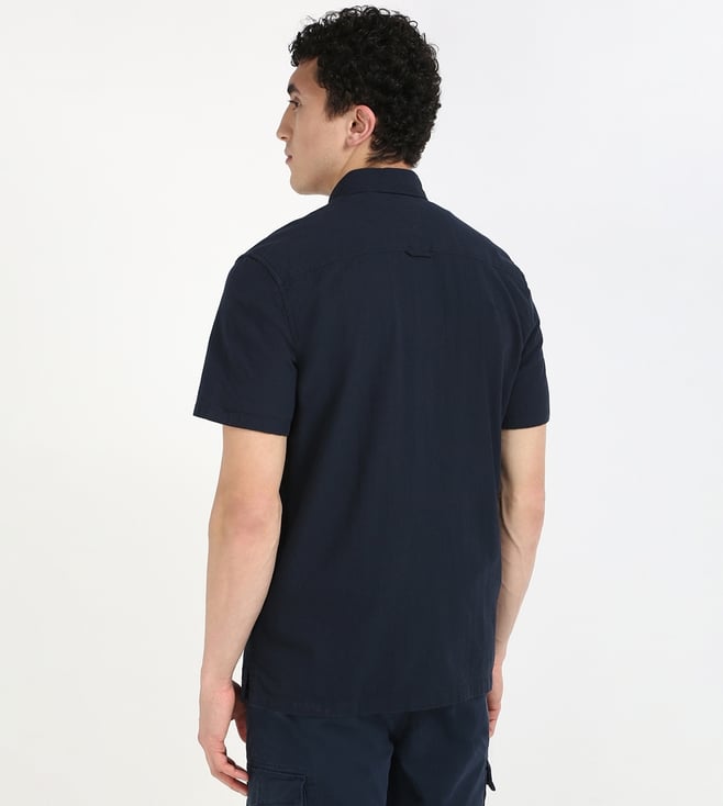 A timeless classic, this navy blue shirt exudes sophistication and effortless style. Crafted from soft, breathable cotton, it offers all-day comfort. The regular fit ensures a flattering silhouette, while the half sleeves provide a touch of casual cool. The button-down collar adds a touch of formality, making it perfect for both work and weekend wear. The solid sleeves create a clean and modern look, while the navy blue hue complements any skin tone.