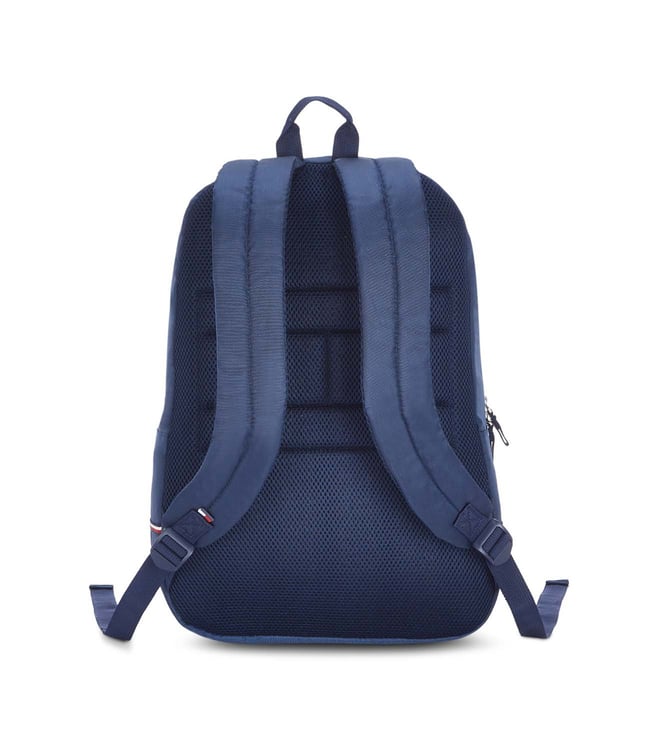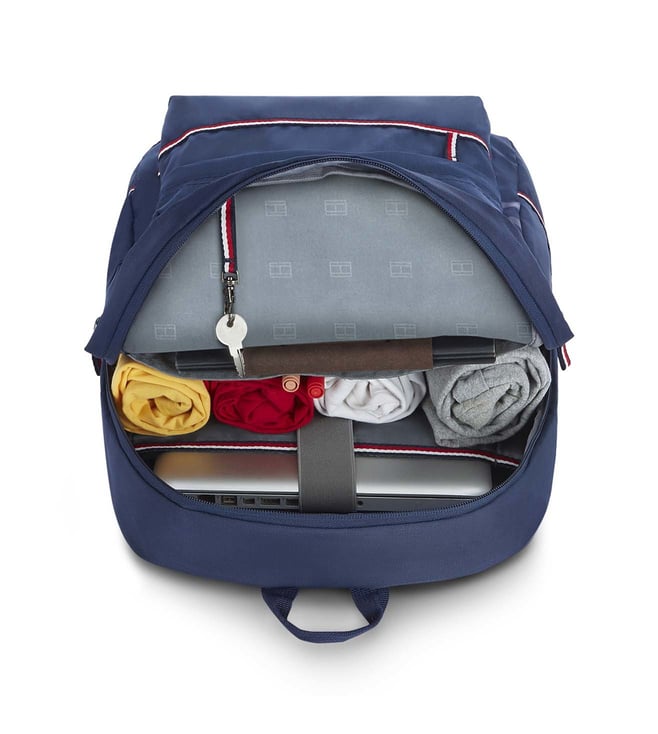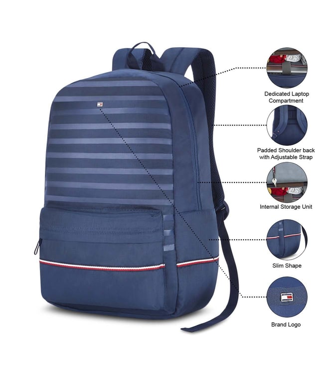 Put an end to your search for a perfect accessory with this unisex laptop backpack from the Coppel collection by Tommy Hilfiger. Adorned with a printed pattern, this navy backpack features a spacious compartment to accommodate a 15-inch laptop and other essentials in a safe manner. While good quality polyester assures durability, the adjustable straps promise carrying comfort. The zip closure will keep your valuable belongings secure.
