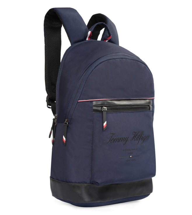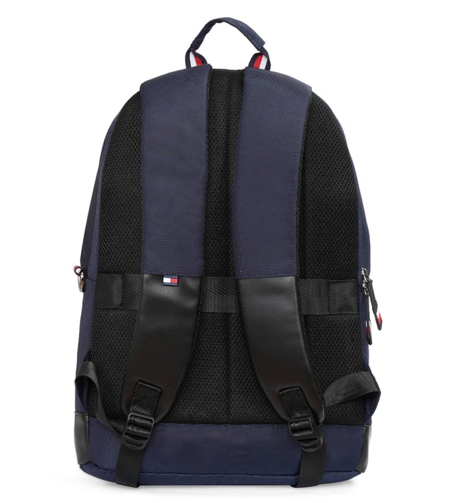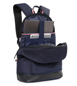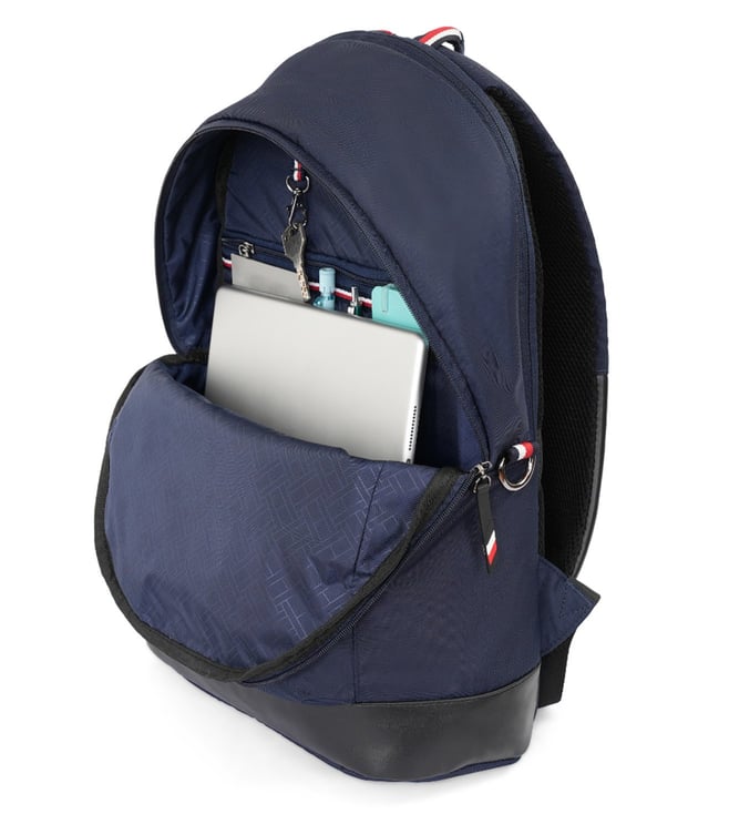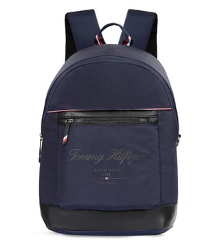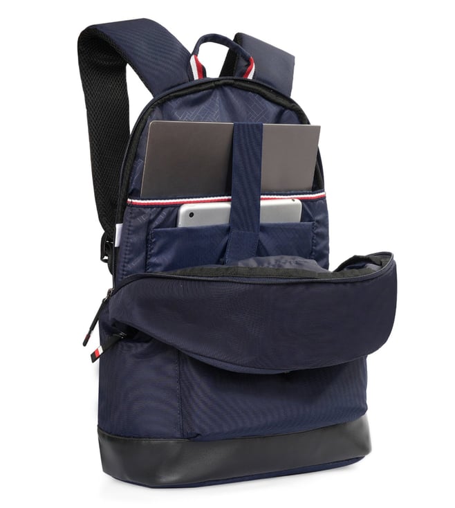 The TOMMY HILFIGER copter laptop backpack in a classic navy color is a fusion of style and practicality, designed for modern commuters and students. Constructed from high-quality water-resistant polyester fabric with distinct pu detailing at the bottom and back strap, this bag is both durable and fashionable. With a 20-liter capacity and two main compartments, it provides ample space for essentials, including a dedicated padded sleeve for a 14-inch laptop and a separate sleeve for your i-pad. Enhanced with a multi-utility organizer with a metal dog hook, a front zipper pocket.