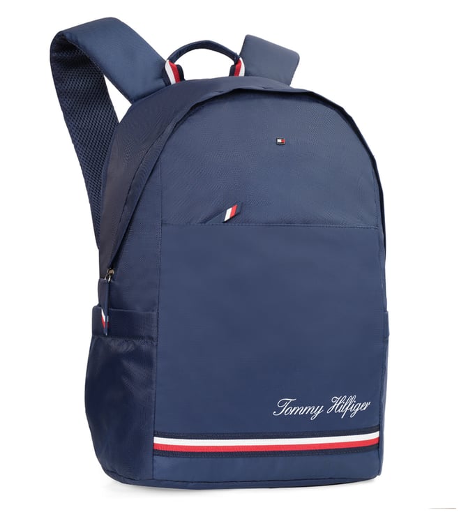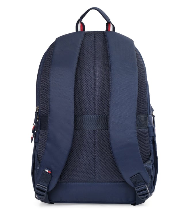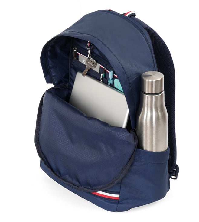 Elevate your everyday carry with the TOMMY HILFIGER emett laptop backpack in a sleek navy color. This bag is the perfect fusion of iconic style and practical design, featuring a water-resistant finish and a modern dome shape. The spacious dual-compartment interior offers a generous 21-liter capacity, including a dedicated padded sleeve for a 14-inch laptop and a separate sleeve for your i-pad. Stay organized with a multi-utility organizer and a metal key holder, while the back trolley holder provides seamless travel convenience.