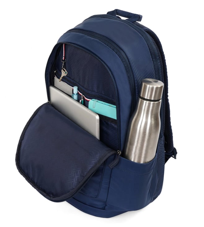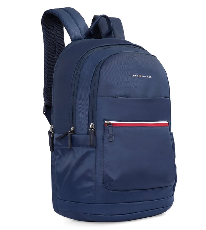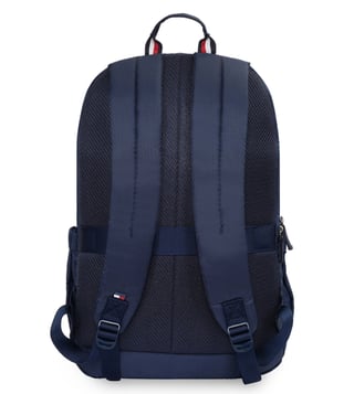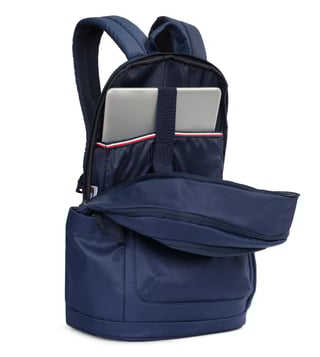 Elevate your everyday carry with the TOMMY HILFIGER hubbard laptop backpack in a sleek navy color. This bag is the ultimate fusion of advanced functionality and iconic style. It features a spacious three-compartment design with a generous 29-liter capacity, including a dedicated padded sleeve for a 15-inch laptop. An included branded rain cover ensures your belongings stay protected in all weather conditions. The bag is thoughtfully designed with a multi-utility organizer and a metal key holder, while the back trolley holder provides seamless travel convenience.