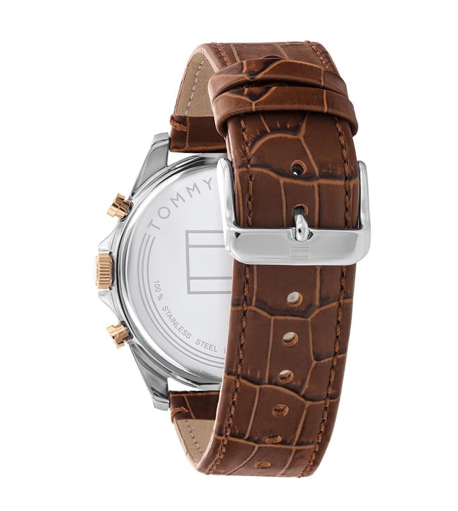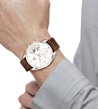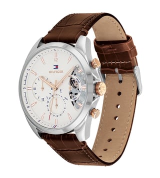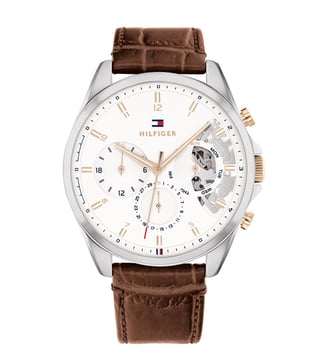 Get this men's analog watch from the Sport collection by Tommy Hilfiger to make a strong style statement. Its round-shaped white dial bears a multifunction functionality to keep you on time. The genuine leather strap of this watch exudes a brown hue for an eye-catching look. Its buckle clasp ensures a secured grip around the wrist.