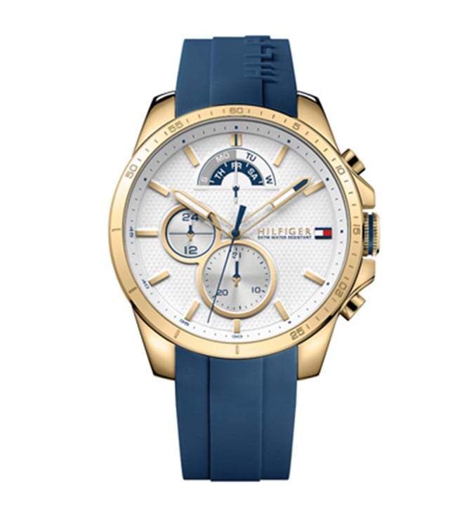 Get this men's analog watch from the Sport collection by Tommy Hilfiger to boost your style. Its round-shaped white dial is protected in a case of 48 mm diameter. It bears multifunction functionality to keep you on time. The silicon strap of this watch exudes a blue hue for an eye-catching look. Its buckle clasp ensures a secured grip around the wrist.