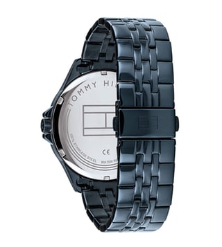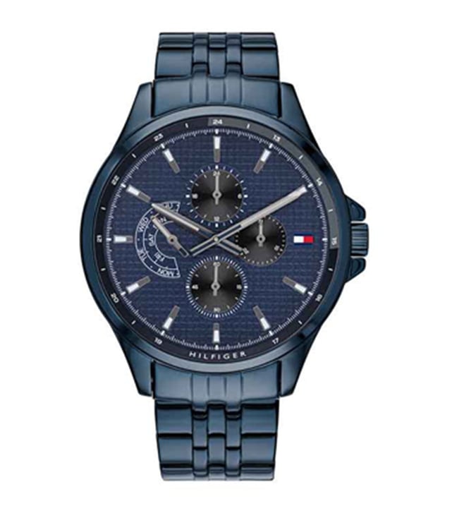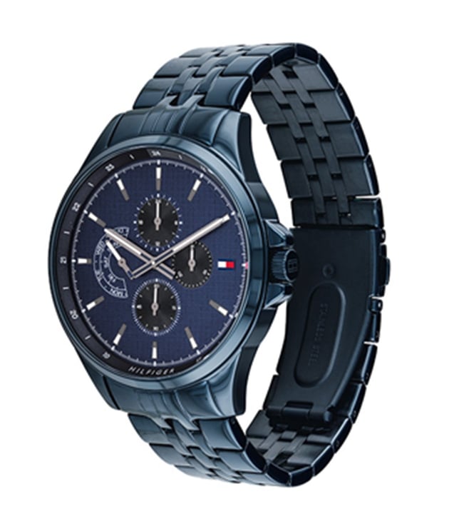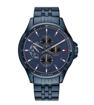 Heighten your casual look by wearing this men's analog watch from the Dress collection by Tommy Hilfiger. Its round-shaped blue dial is protected in a case of 46.3 mm diameter. It bears multifunction functionality to keep you on time. The stainless steel bracelet of this watch exudes a blue hue for an eye-catching look. Its push button clasp ensures a secured grip around the wrist.