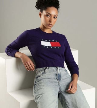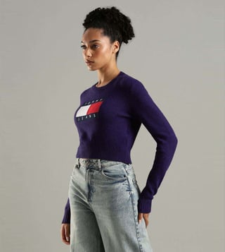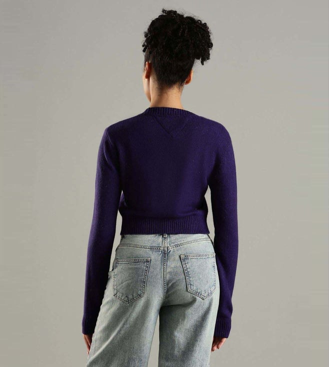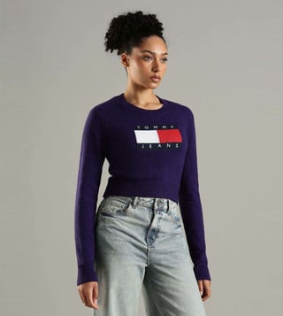 Be the cynosure of all eyes by wearing this purple slim fit sweater from TOMMY HILFIGER. Tailored to sartorial perfection from premium quality fabric, it assures a soft and soothing touch against the skin. The round neck adds to its appeal. It emanates a brand logo which makes it a unique choice.
