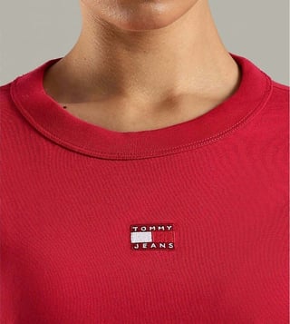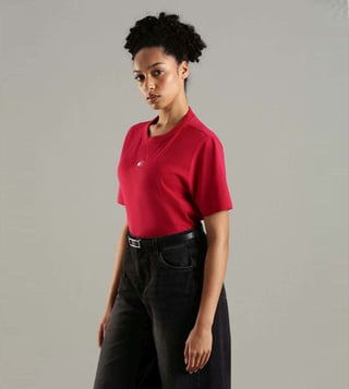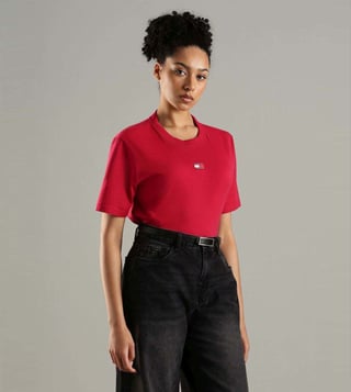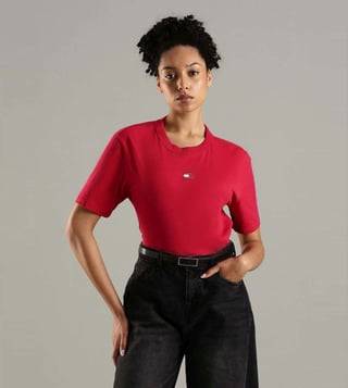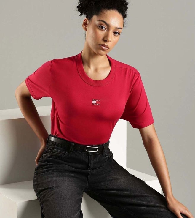 Curate a stylish look by wearing this red regular fit t-shirt from TOMMY HILFIGER. Tailored to sartorial perfection from premium quality fabric, it assures a soft and soothing touch against the skin. The round neck adds to its appeal. Exuding short sleeves, it is sure to fetch you compliments from all.
