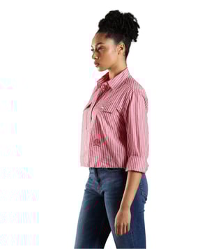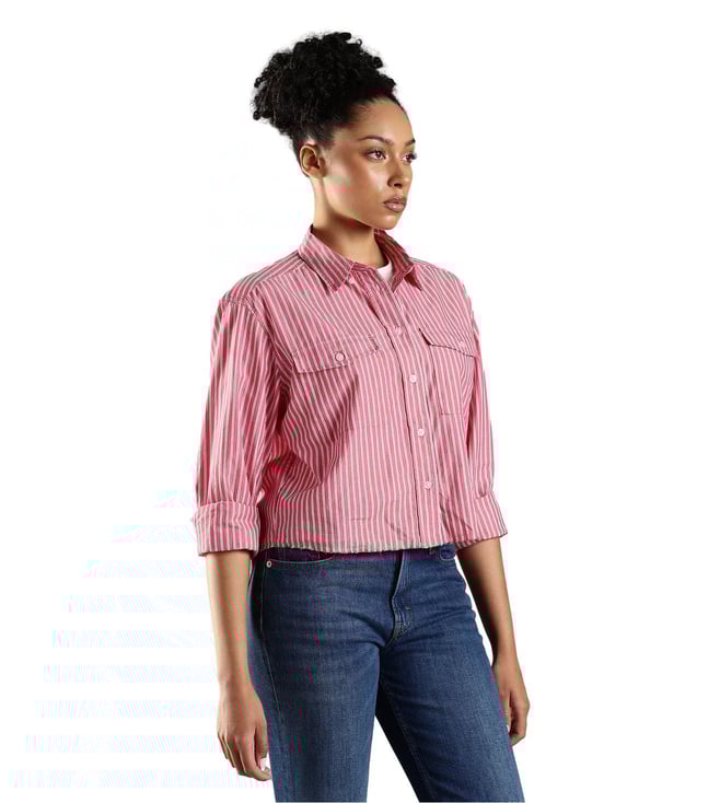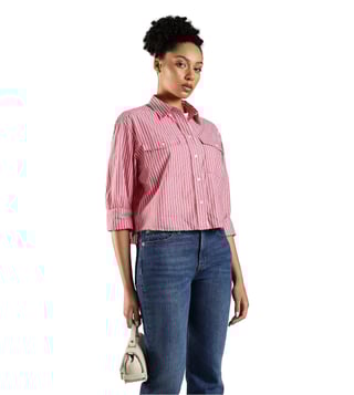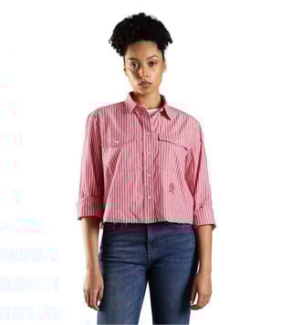 Make a bold statement with this shirt from Tommy Hilfiger featuring vertical stripes. Stylish and versatile, it pairs with jeans or layers over tanks for a crisp yet relaxed look suitable for everyday wear.