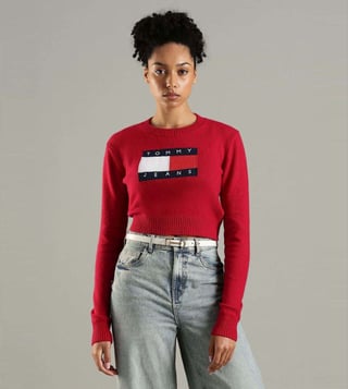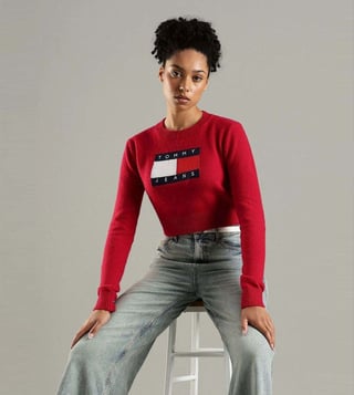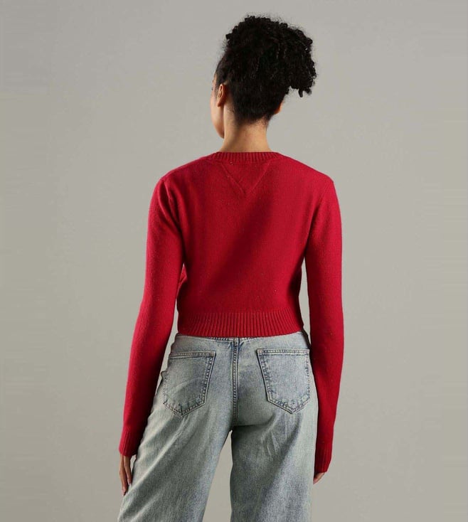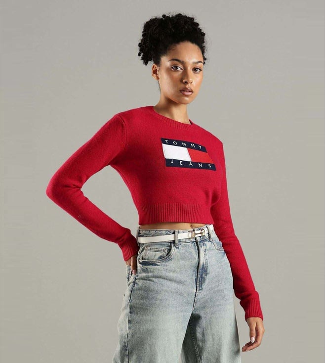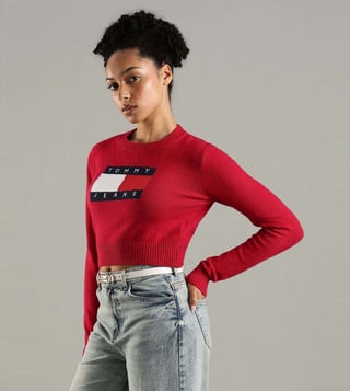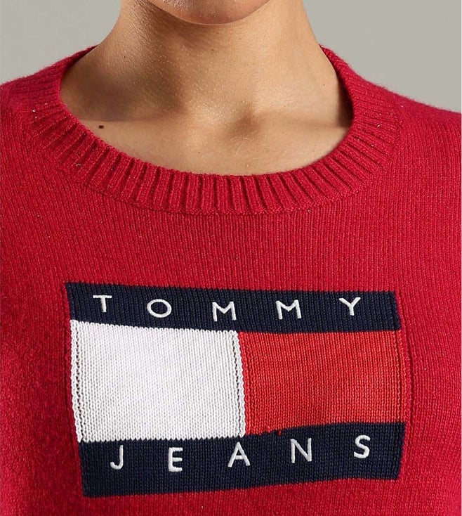 Captivate the mob by wearing this red slim fit sweater from TOMMY HILFIGER. Tailored to sartorial perfection from premium quality fabric, it assures a soft and soothing touch against the skin. The round neck adds to its appeal. It emanates a brand logo which makes it a unique choice.
