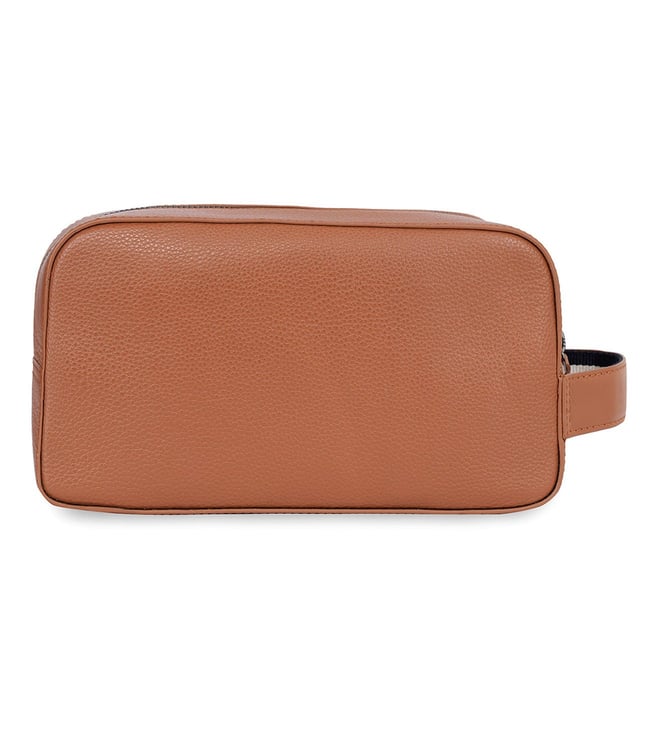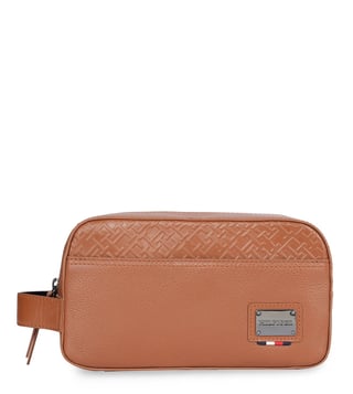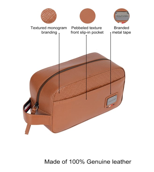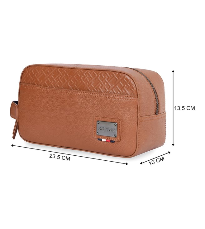 Elevate your travel experience with this luxurious toiletry kit from Tommy Hilfiger. Designed for the modern traveller, this unisex pouch blends timeless elegance with practical functionality. The premium leather construction features a soft pebbled texture that adds a refined edge to your essentials. The compact silhouette easily fits into your luggage or carry-on, making it ideal for organizing grooming or self-care items on the go. Its subtle embossed branding and rich tan tone reflect the sophistication that Tommy Hilfiger is known for.