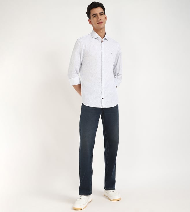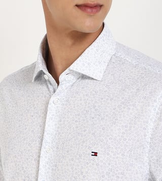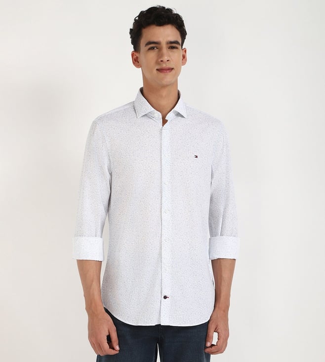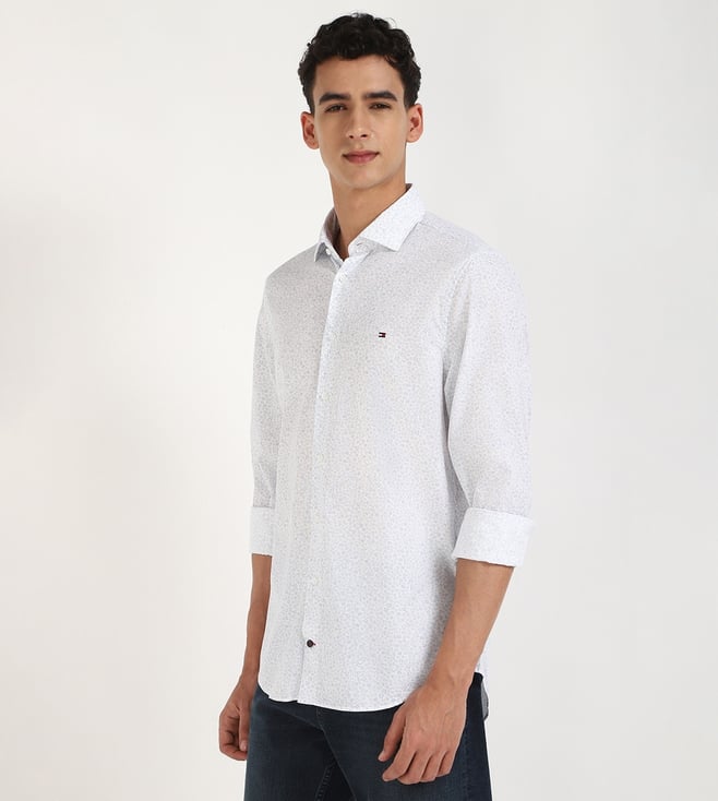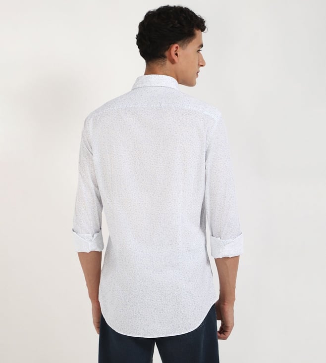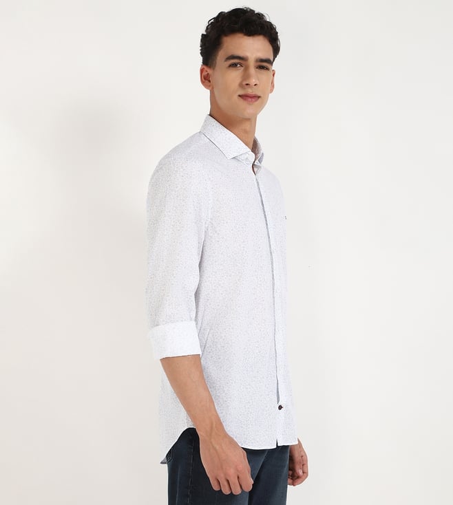 A crisp white canvas for your style. This slim-fit shirt, crafted from breathable cotton, boasts a classic collar and full sleeves adorned with a captivating print. The tailored fit accentuates your physique, while the white hue provides a clean and versatile backdrop for any occasion. From casual outings to formal events, this shirt effortlessly transitions between styles, making it a wardrobe essential.
