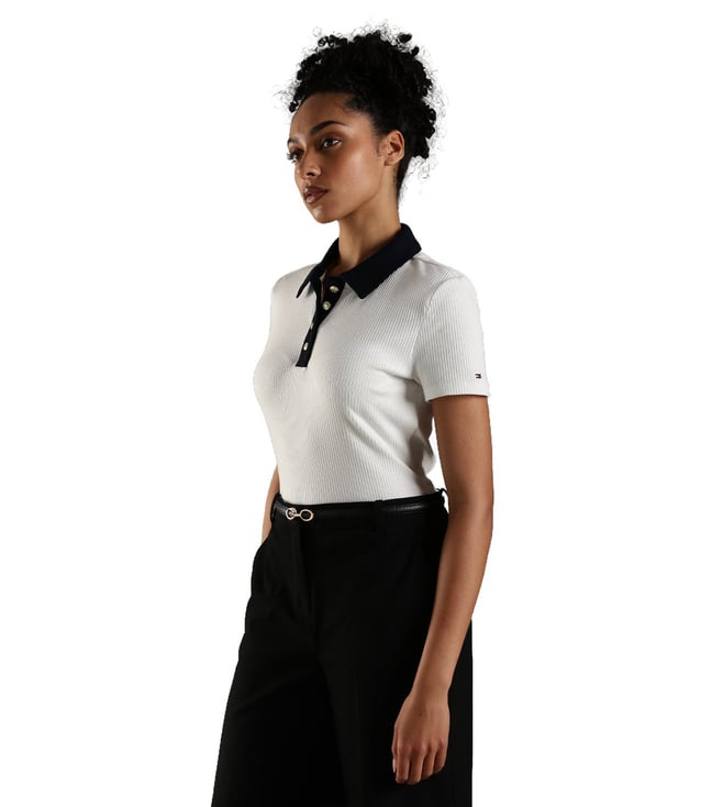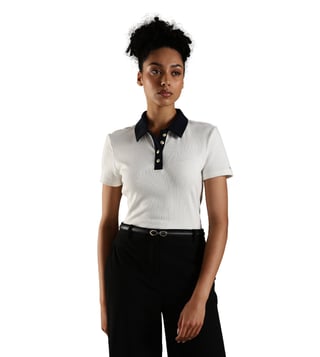 Elevate your casual style with the TOMMY HILFIGER White Slim Fit Polo T Shirt. Crafted with premium quality materials, this timeless piece offers a sleek and tailored silhouette that flatters your figure. The classic white hue adds a touch of sophistication to any outfit, making it a versatile staple for your wardrobe. Whether you're dressing up for a night out or keeping it casual for a weekend brunch, this polo shirt effortlessly combines comfort and style. Upgrade your look with this must-have essential from TOMMY HILFIGER.