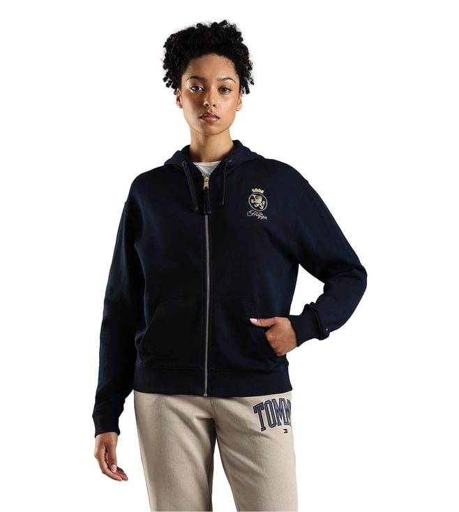 Navy Cotton Regular Fit Logo Printed Hooded Jacket