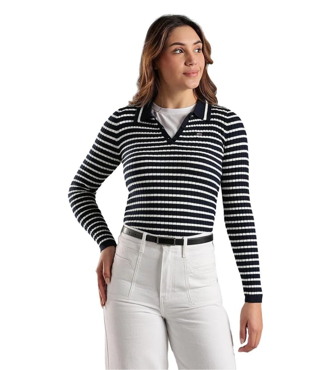 White & Navy Stripe Slim Fit Cotton Polo Collar Sweater