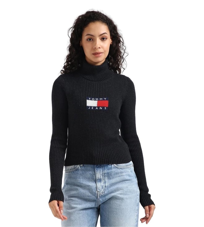 Black Slim Fit Polyester Mock Neck Front-Open Sweater