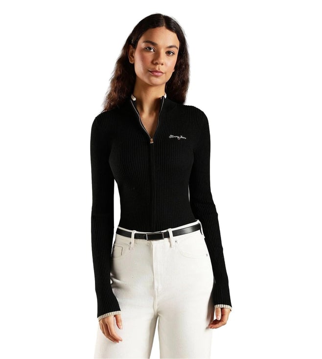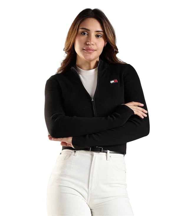 Black Slim Fit Polyester Mock Neck Front-Open Sweater