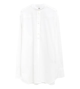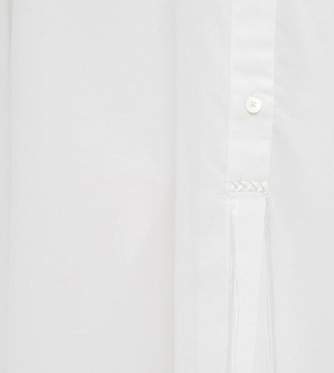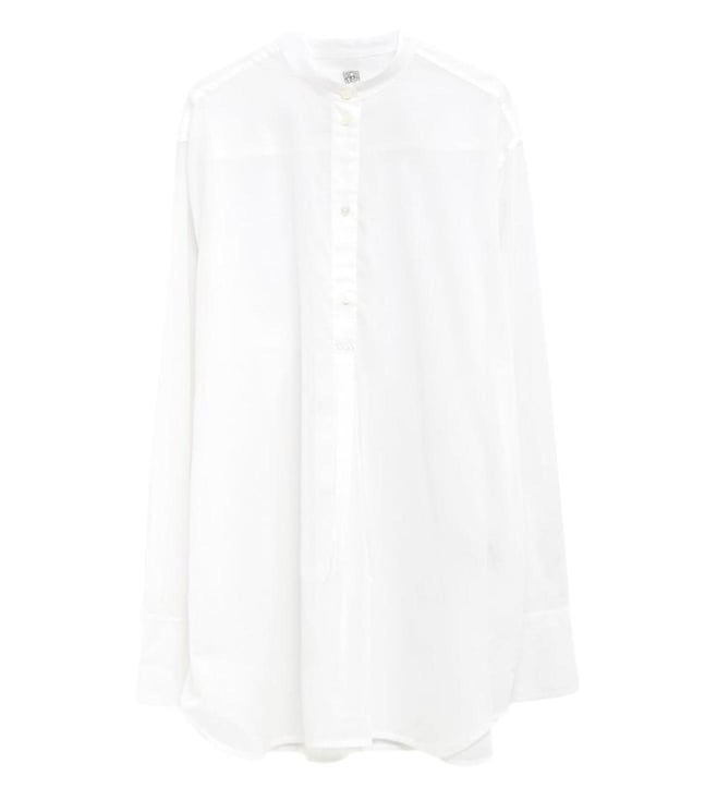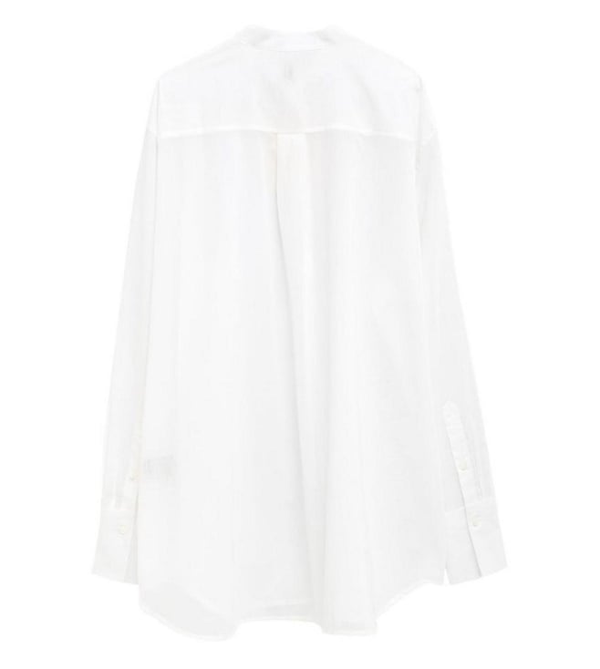 Elevate your wardrobe with this elegant white casual shirt, crafted from 100% organic cotton for a soft, breathable feel. Its solid pattern exudes timeless sophistication, while the long sleeves and band collar add a touch of modern flair. Designed for the discerning woman, this shirt features a sleek closure that ensures a perfect fit. Whether paired with jeans for a relaxed look or a skirt for a more polished ensemble, this versatile piece is a must-have staple for any fashion-forward closet.