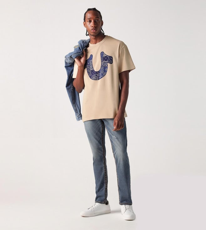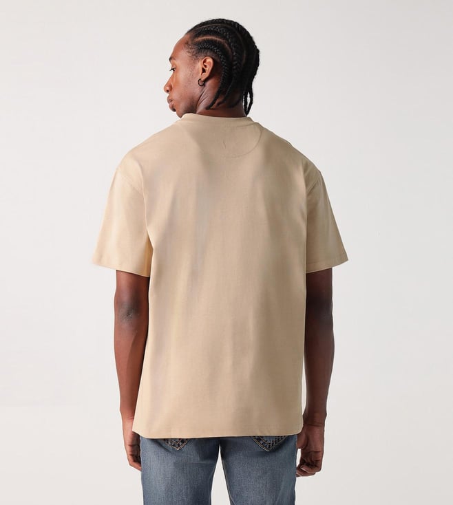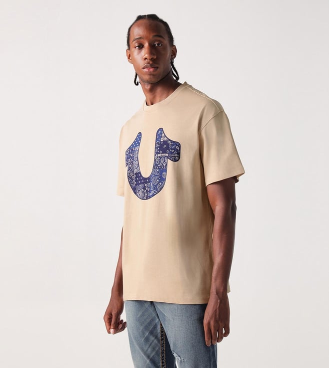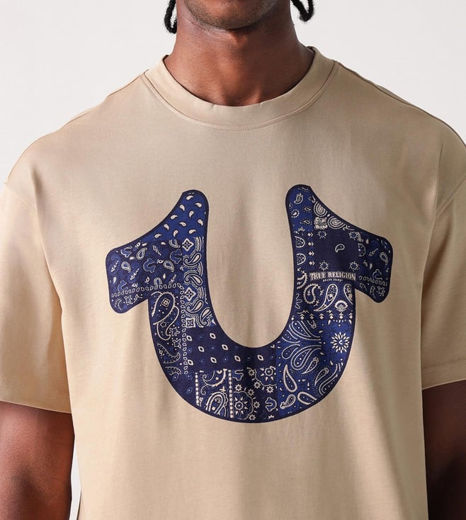 Elevate your casual style with the TRUE RELIGION Men's Beige Cotton logo crew neck T-shirt. Crafted from soft cotton knit. This pullover features a boxy fit and short sleeves for a comfortable yet stylish look. The iconic True Religion logo adds a touch of luxury to this wardrobe staple. Perfect for everyday wear. This versatile shirt is sure to become a favorite in your collection. Upgrade your wardrobe with this effortlessly cool and timeless piece.