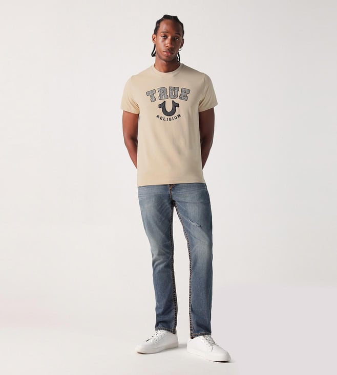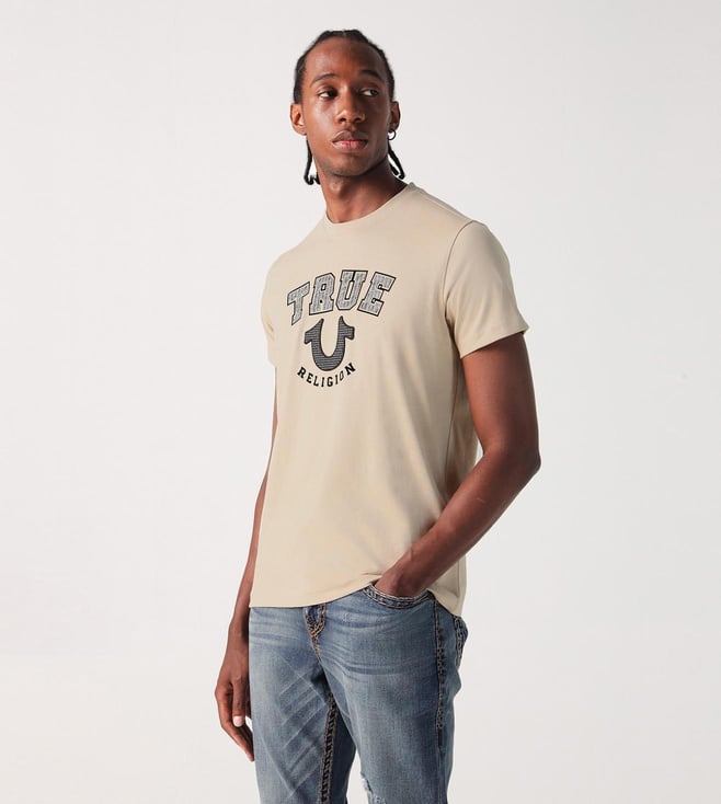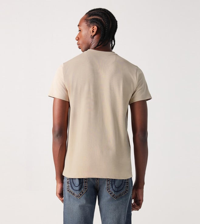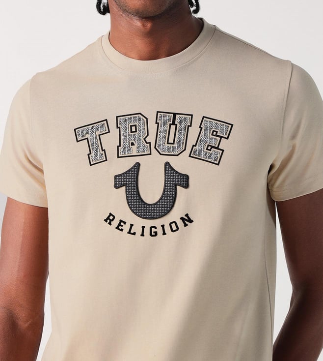Elevate your casual wardrobe with the TRUE RELIGION Men's Beige Cotton knitted logo crew neck T-shirt. Crafted from premium cotton. This short-sleeve pullover offers a comfortable and breathable fit. The signature logo detailing adds a touch of sophistication, while the boxy fit provides a modern and relaxed silhouette. Perfect for everyday wear. This versatile t-shirt effortlessly combines style and comfort, making it a must-have addition to any fashion-forward man's closet.