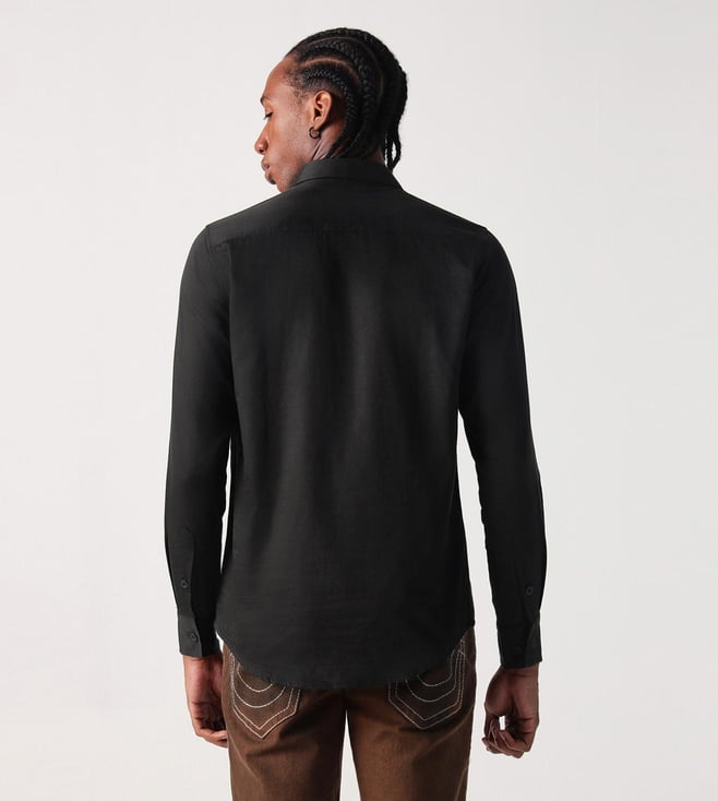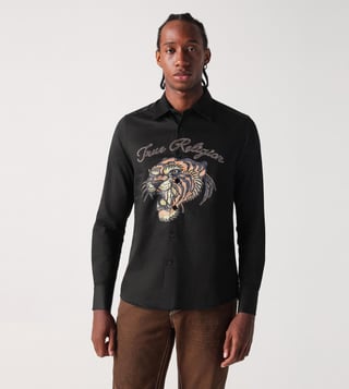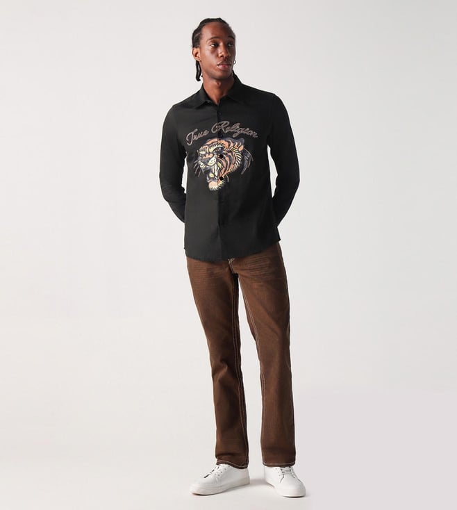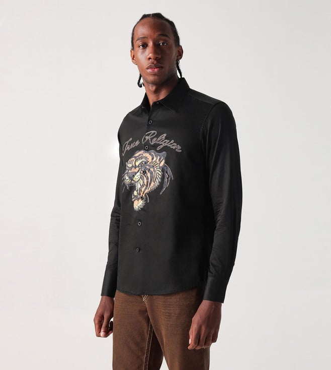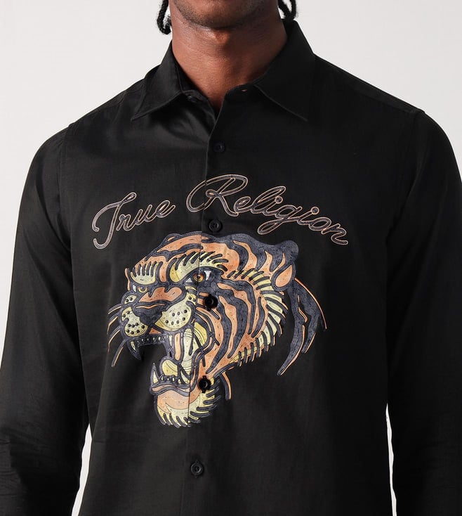 this TRUE RELIGION Men's Black Cotton Printed shirt crafted from premium cotton. This shirt features a modern printed design, a classic collar, and long sleeves for a sophisticated look. The regular fit ensures comfort and versatility, making it perfect for any occasion.