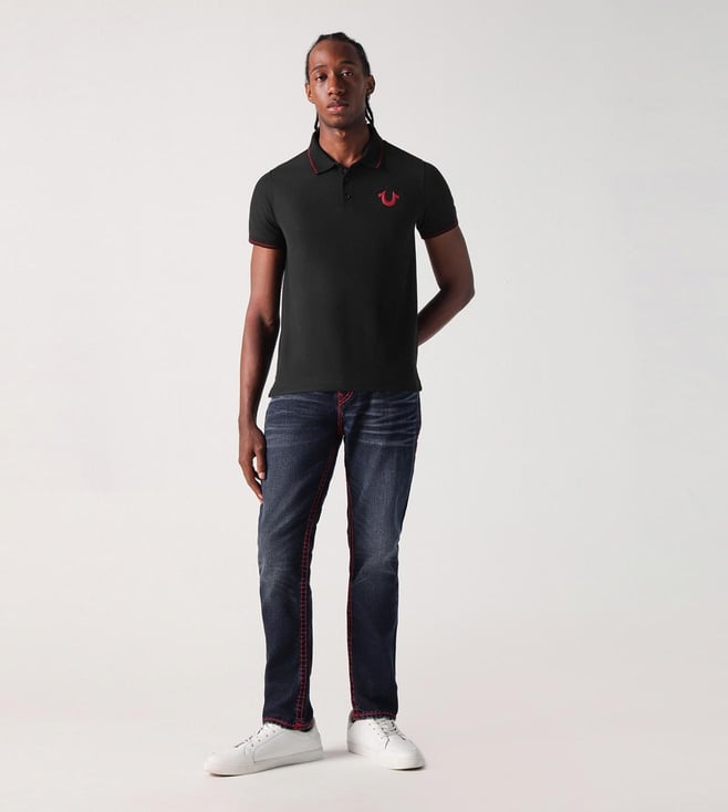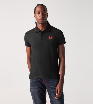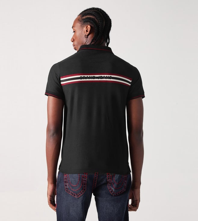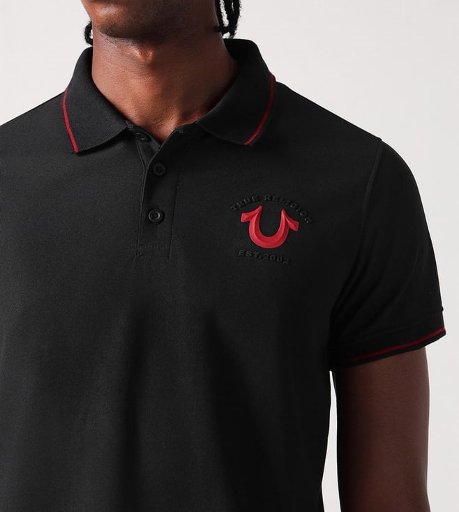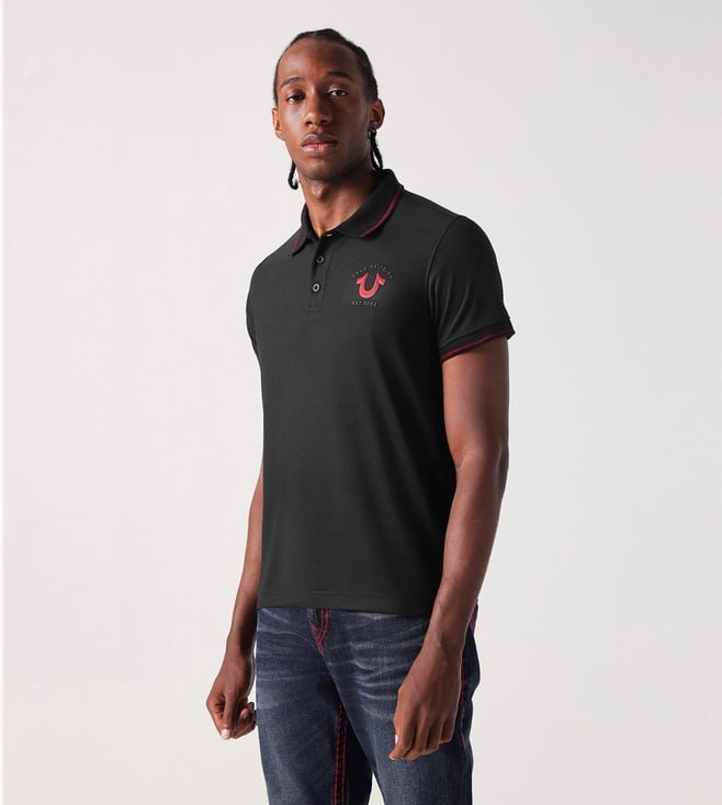 this TRUE RELIGION Men's Black Cotton Polo T shirt crafted from premium cotton knit. This solid polo neck shirt features short sleeves and a regular fit for ultimate comfort and style. The button detail adds a touch of sophistication, making it perfect for both casual outings and semi-formal events. Stay effortlessly cool and trendy with this versatile wardrobe essential that combines comfort, quality, and style in one. Upgrade your wardrobe with TRUE RELIGION's timeless and sophisticated polo shirt today.