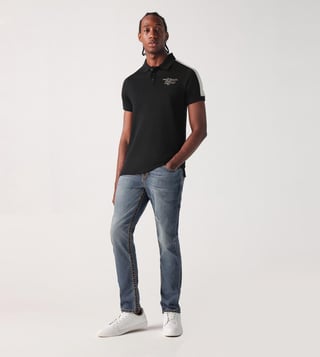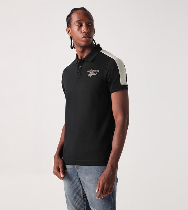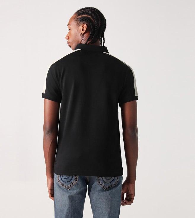 This TRUE RELIGION Men's Black Polo T shirt crafted from a high-quality blended knit fabric. This pullover features a classic polo neck and short sleeves for a timeless look. The regular fit ensures comfort and ease of movement, while the solid black color adds versatility to your wardrobe. Whether you are dressing up or keeping it casual. This polo shirt is the perfect choice for any occasion. Upgrade your closet with this essential piece that seamlessly blends style and comfort.