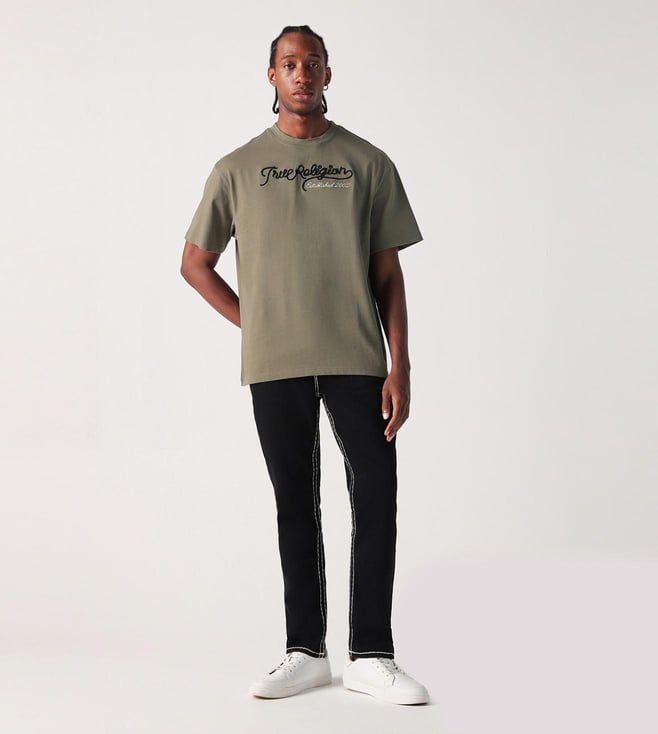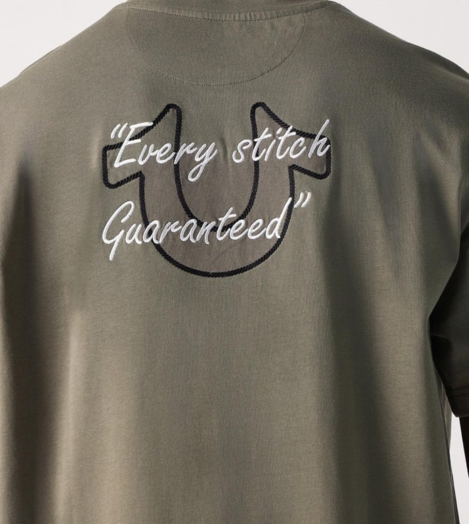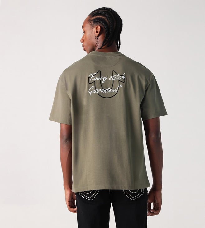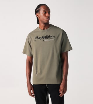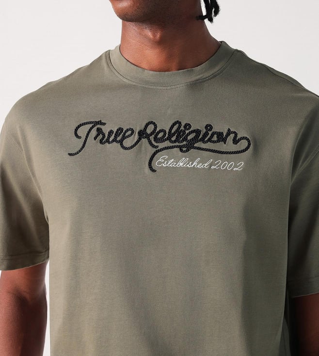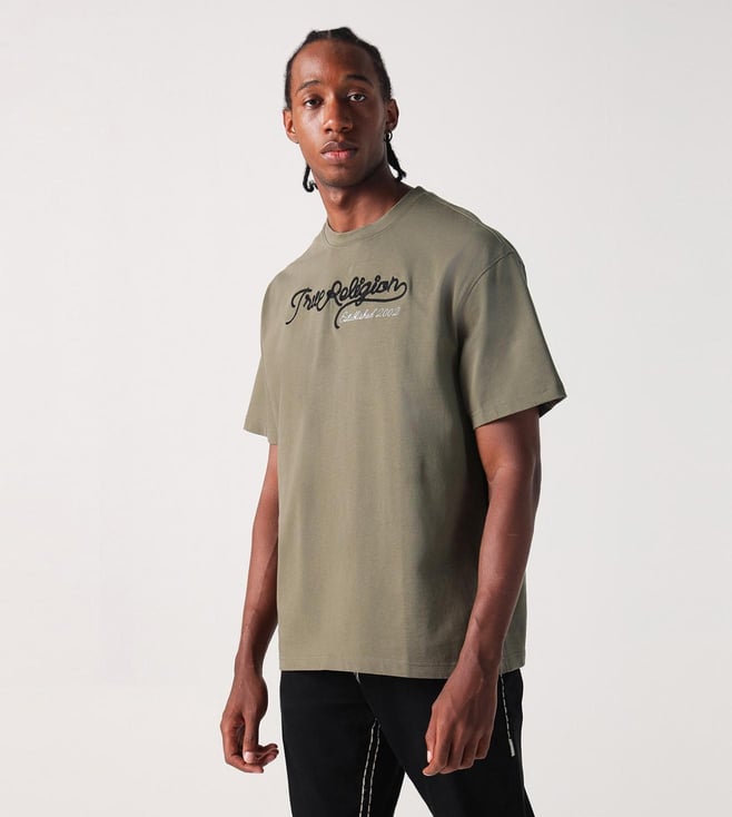 Elevate your casual wardrobe with the TRUE RELIGION Men Dark Olive Cotton knitted logo crew neck short sleeves Pullover Boxy fit T shirt. Crafted from soft cotton. This stylish tee features a bold logo design, crew neckline, and comfortable short sleeves. The boxy fit offers a modern twist on a classic silhouette, perfect for effortless, on-trend styling. Whether you are running errands or hanging out with friends. This versatile shirt will keep you looking cool and feeling comfortable all day long. Upgrade your everyday look with this must-have piece from TRUE RELIGION.