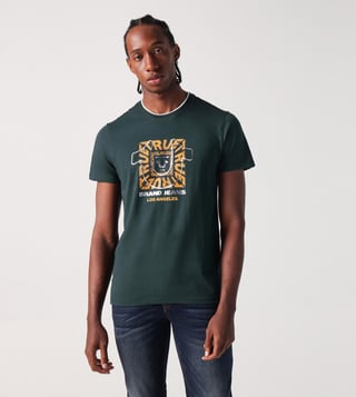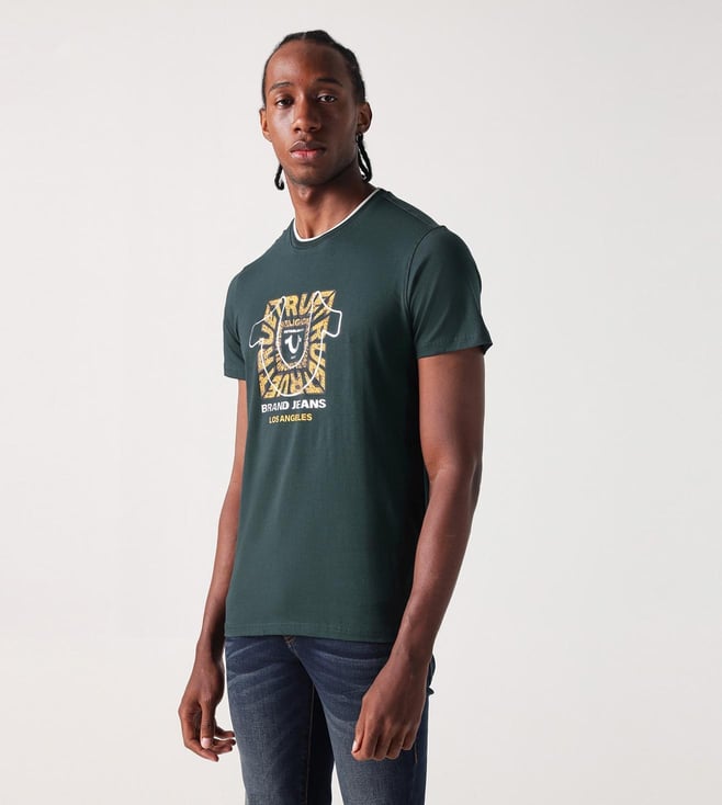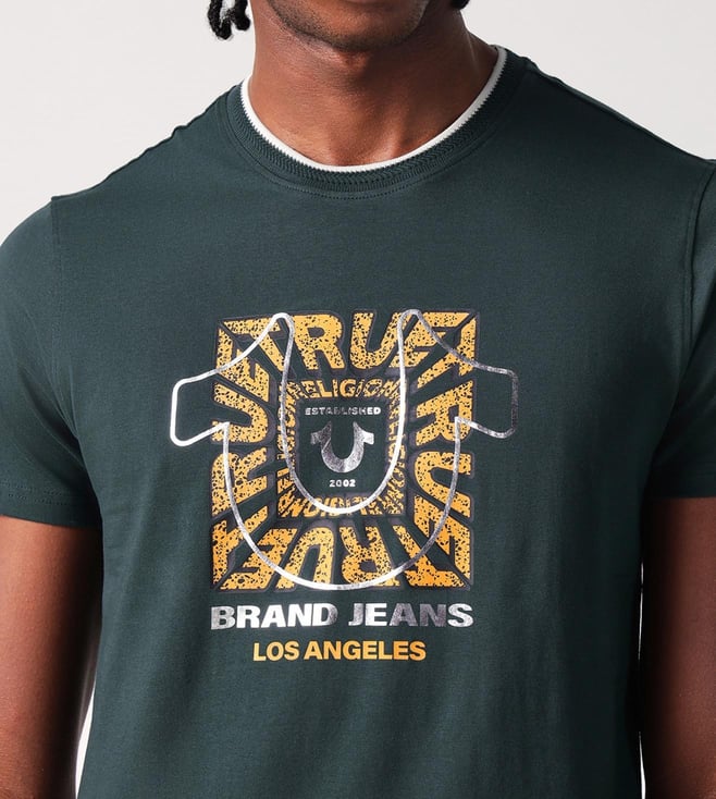 This TRUE RELIGION Men Green Cotton knitted logo crew neck short sleeves Pullover crafted from premium cotton. This regular fit t-shirt offers ultimate comfort and durability. The iconic True Religion logo adds a touch of style, making it a versatile piece for everyday wear. Whether you are running errands or hanging out with friends. This t-shirt is the perfect combination of quality and fashion. Upgrade your look with this must-have wardrobe staple.