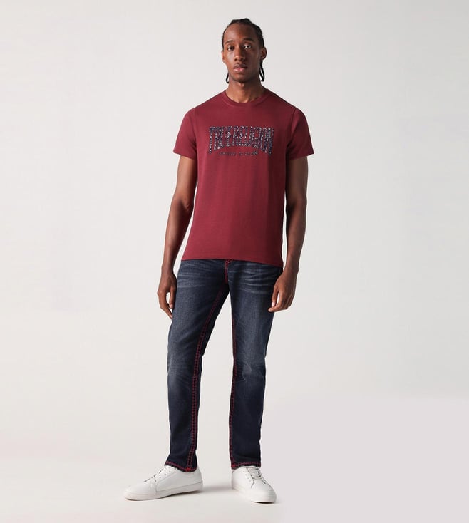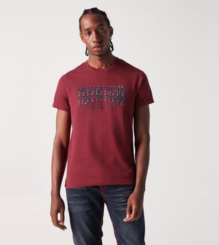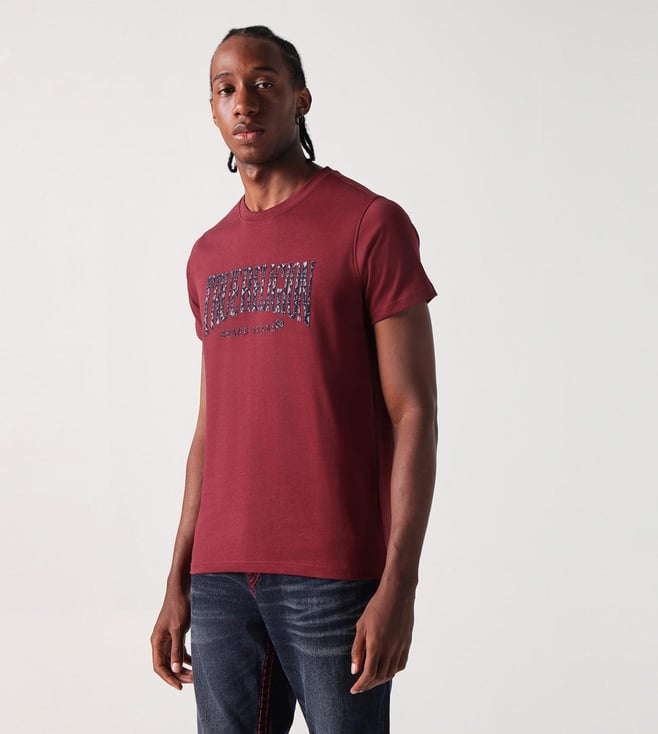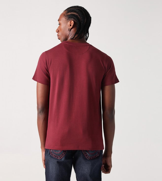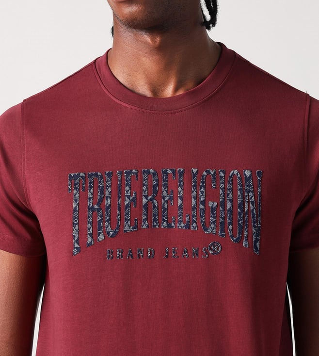 Elevate your casual wardrobe with the TRUE RELIGION Men Maroon Cotton knitted logo crew neck short sleeves Pullover T shirt. Crafted from soft cotton and featuring a classic crew neck and short sleeves. This regular fit shirt offers both comfort and style. The iconic TRUE RELIGION logo adds a touch of sophistication to your everyday look, making it the perfect choice for any occasion. Stay on-trend and effortlessly cool with this versatile piece that will quickly become a staple in your wardrobe.