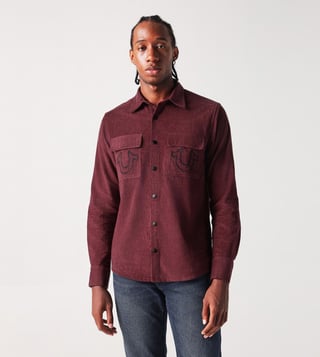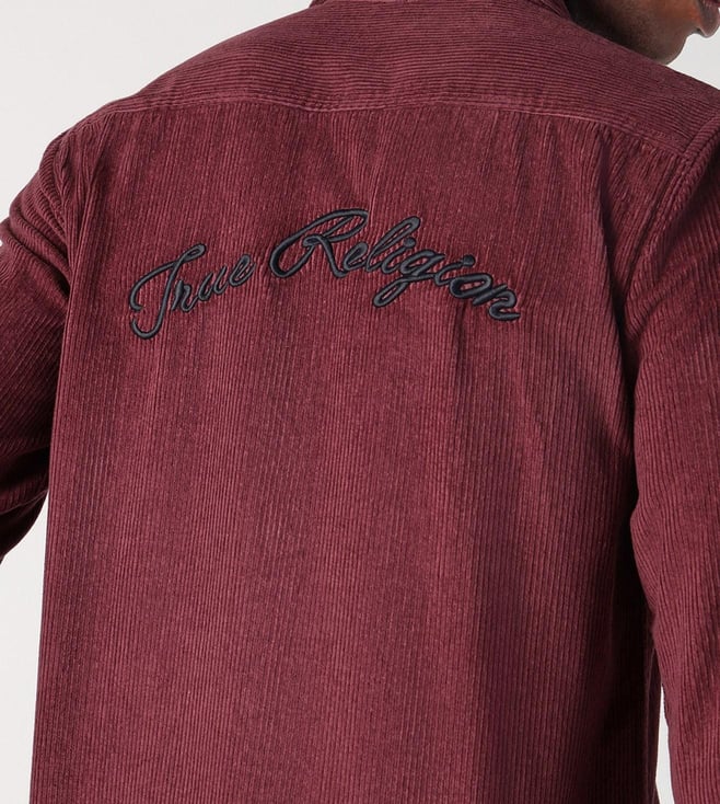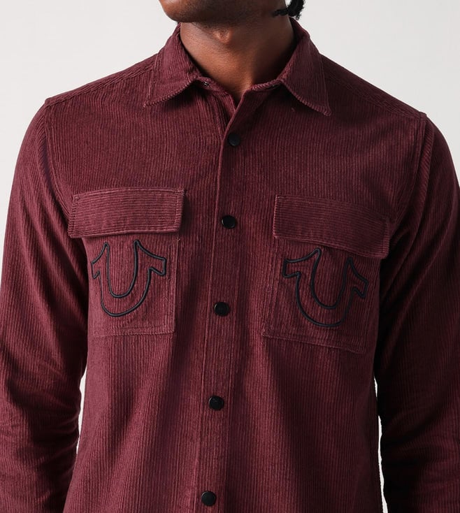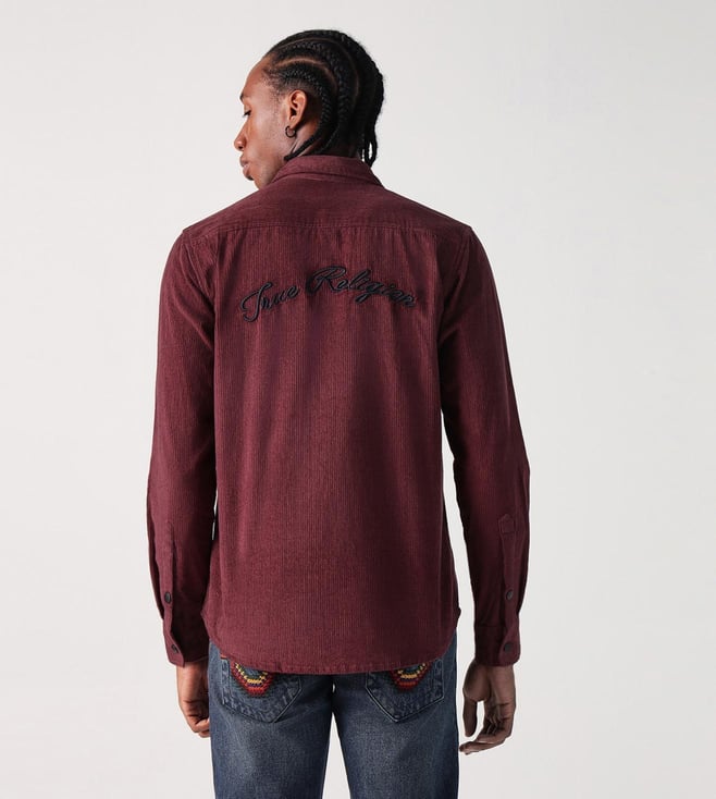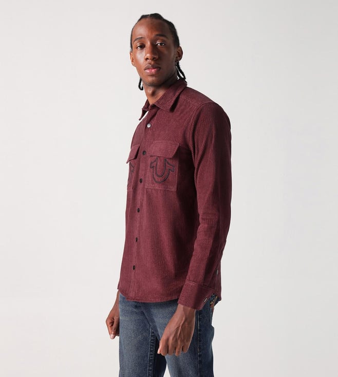 Elevate your wardrobe with the TRUE RELIGION Men Maroon Polyester Textured shirt. This classic piece features a stylish shirt collar, long sleeves, and a button-up design for a polished look. The regular fit ensures comfort and versatility, making it perfect for any occasion. Crafted from high-quality polyester woven fabric. This shirt is durable and easy to care for. Add a touch of sophistication to your outfit with this timeless piece that will quickly become a staple in your closet.