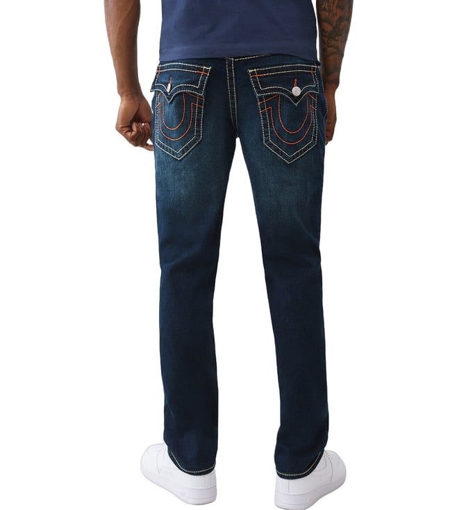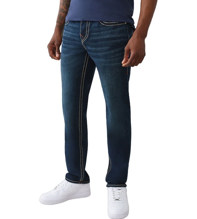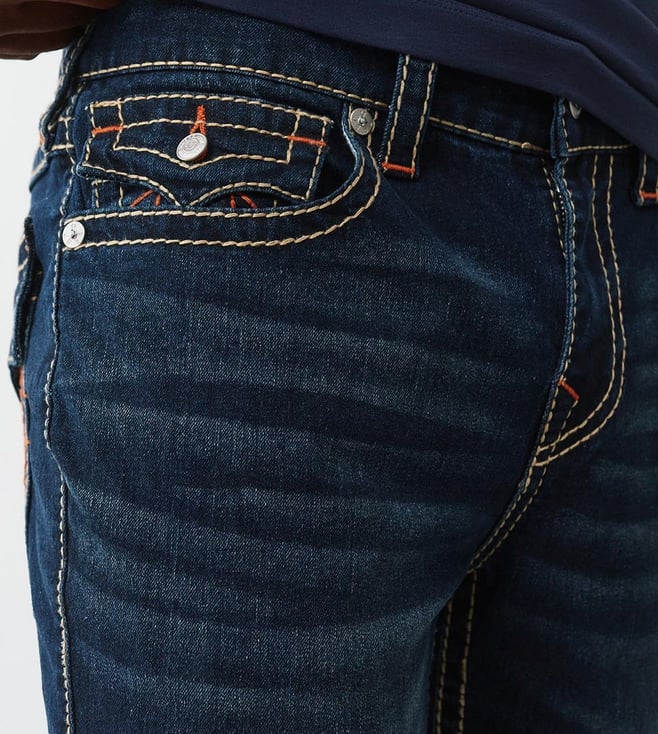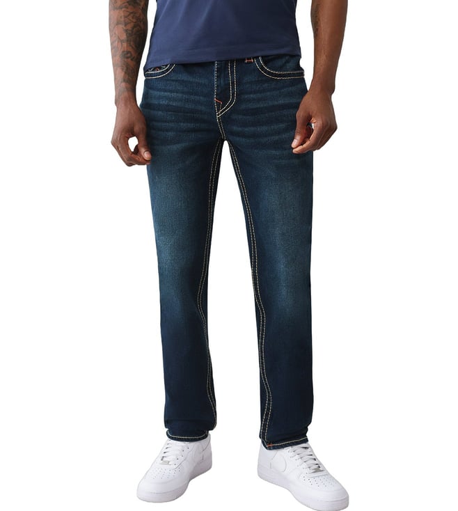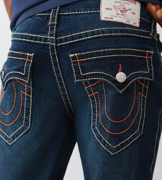 TRUE RELIGION Men's GENO Big T Navy Blue Jeans is crafted with precision and style in mind. This jeans offer a modern slim fit with bold Big T stitching for a unique touch. Made from high-quality denim, they provide both comfort and durability, perfect for everyday wear. Whether you are dressing up or keeping it casual. This jeans effortlessly blend fashion and functionality.