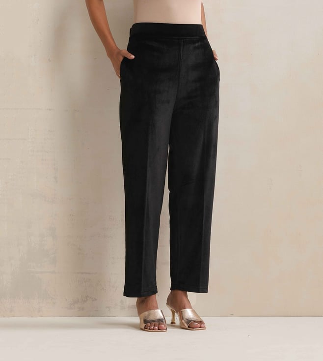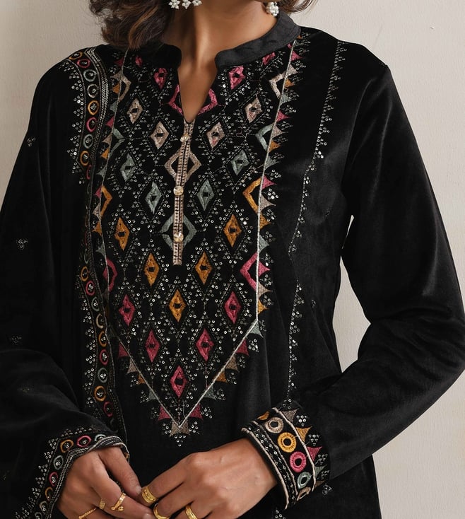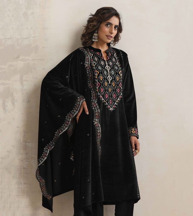 Embrace timeless elegance in this captivating black kurta set. Crafted from luxurious velvet, the kurta features intricate embroidery that dances across the fabric, adding a touch of opulence. The mandarin collar and full sleeves lend a sophisticated air, while the regular fit ensures a flattering silhouette. Paired with matching bottoms and a flowing dupatta, this ensemble is perfect for special occasions or evening gatherings, radiating an aura of sophistication and grace.