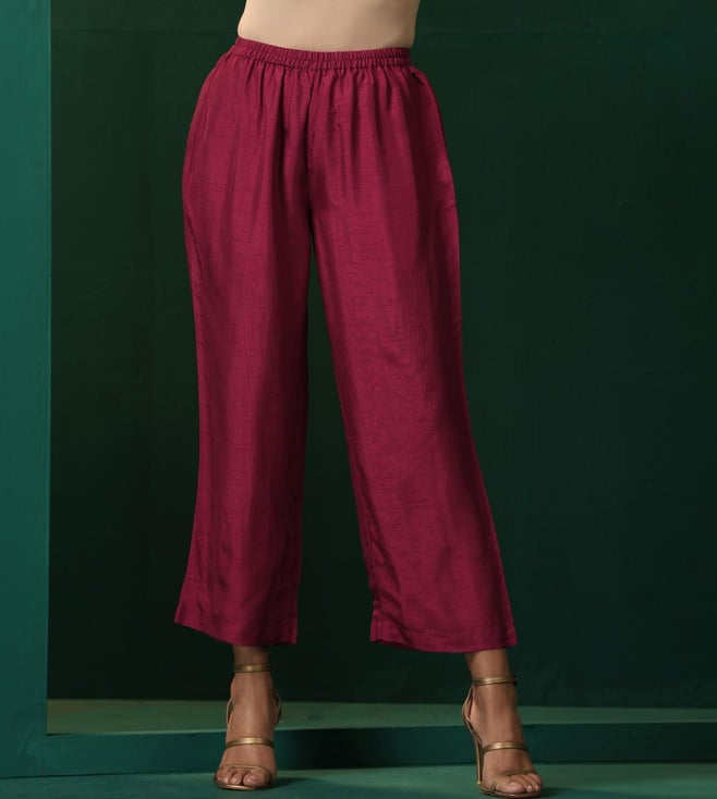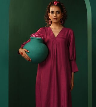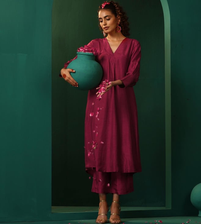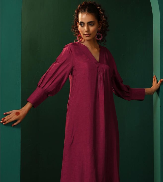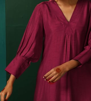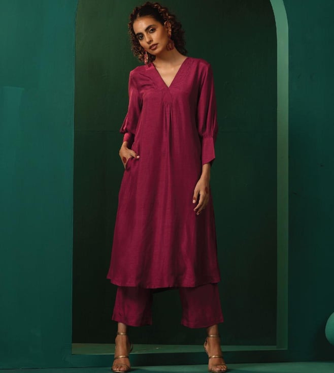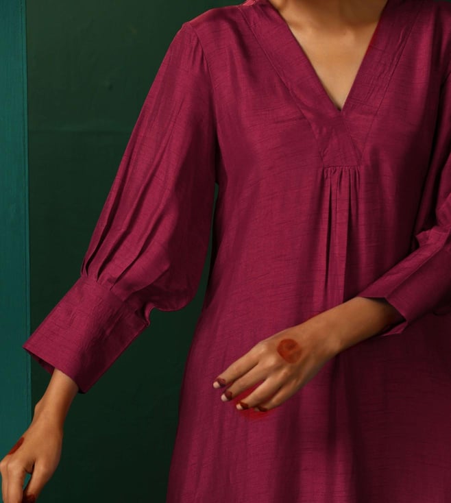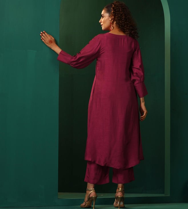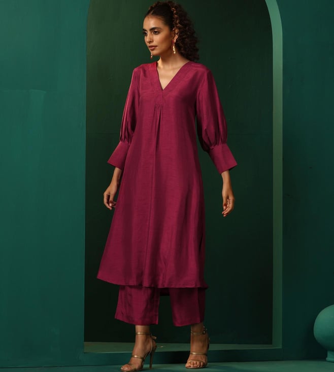 TrueBrowns Maroon Silk Puff Sleeve Kurta Pant Set