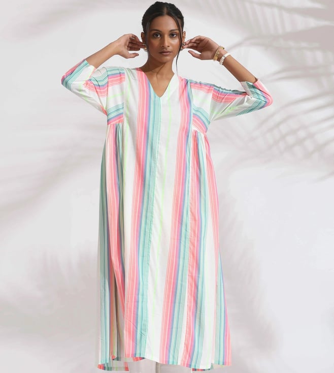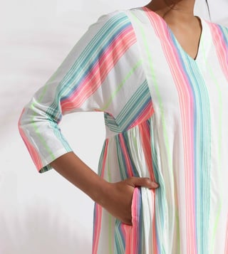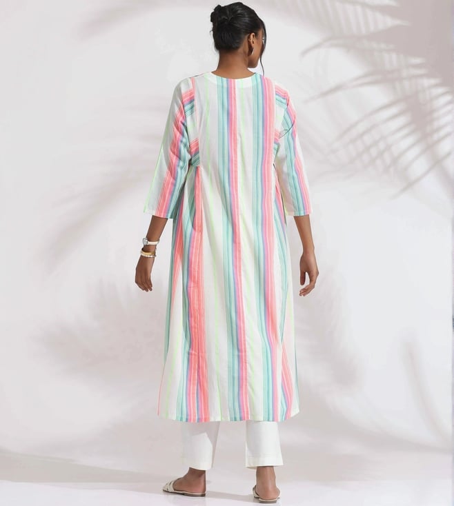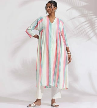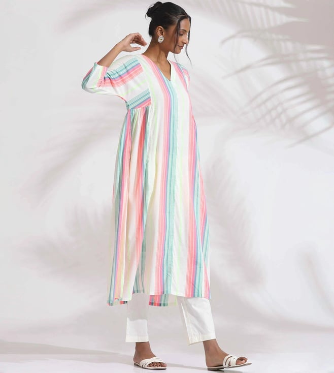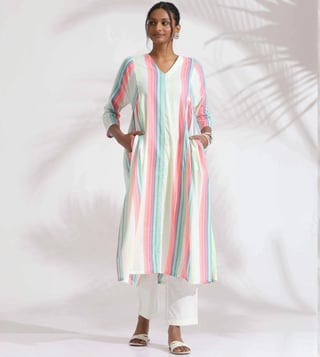 Off-White Cotton Multi Stripe Flared Kurta Set