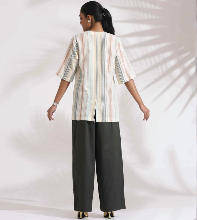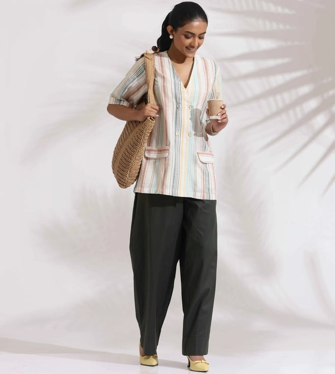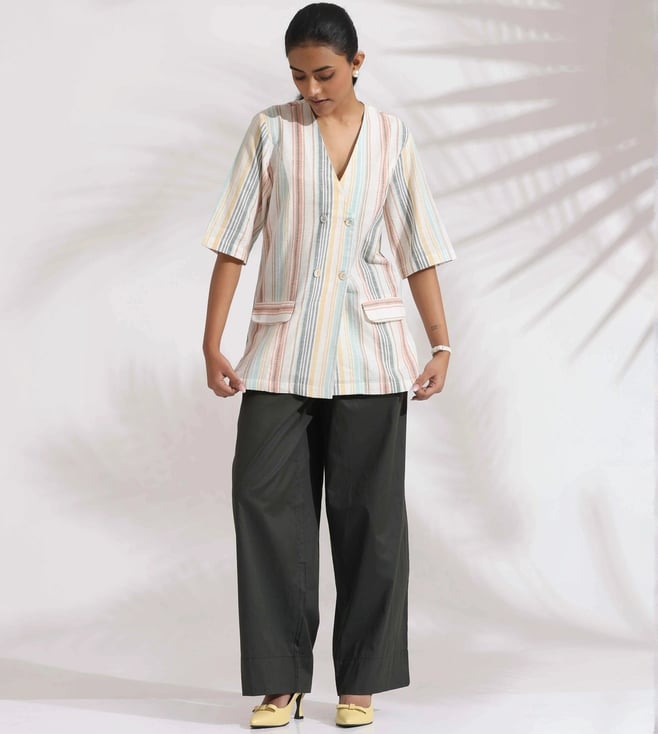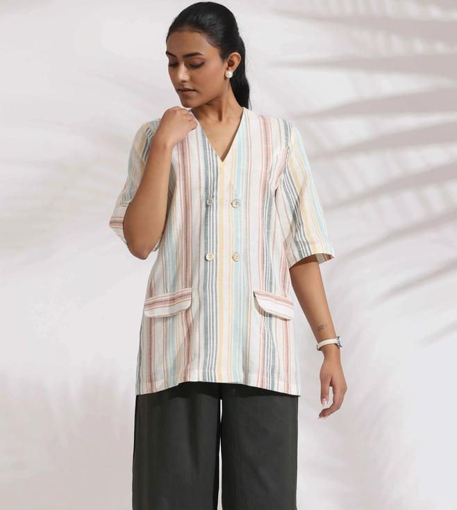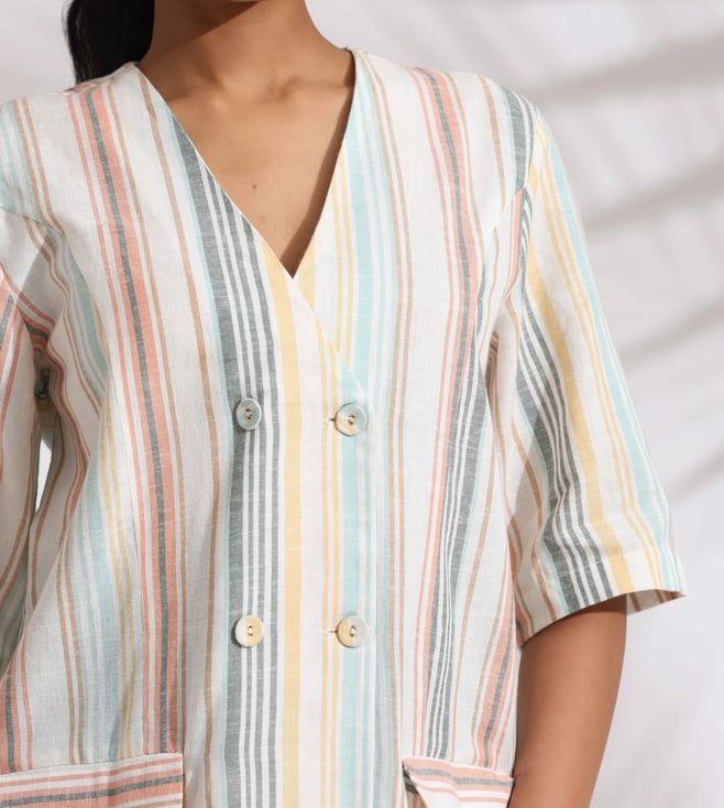 TrueBrowns Off-White Cotton Stripe Jacket Top Co-ord Set