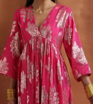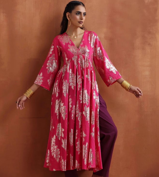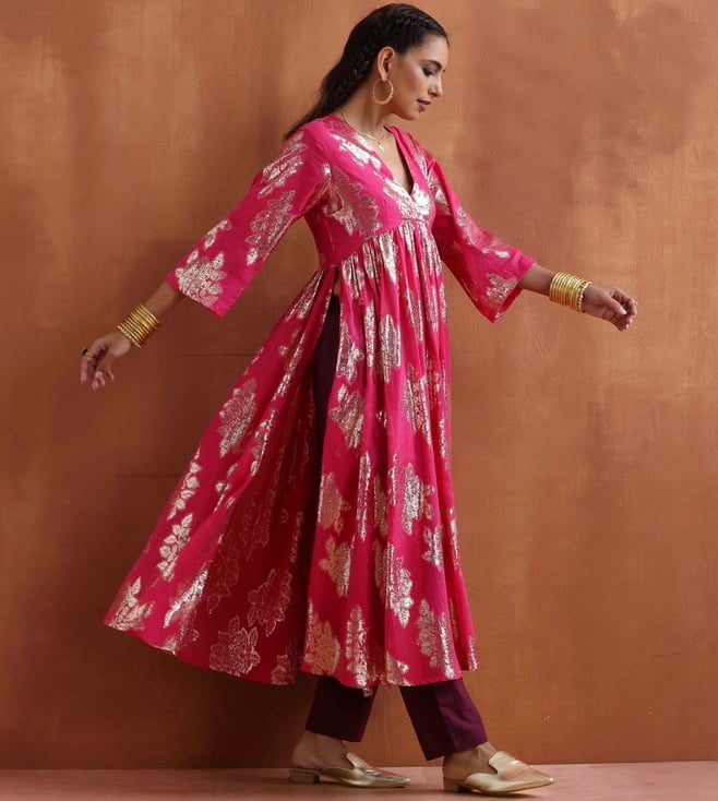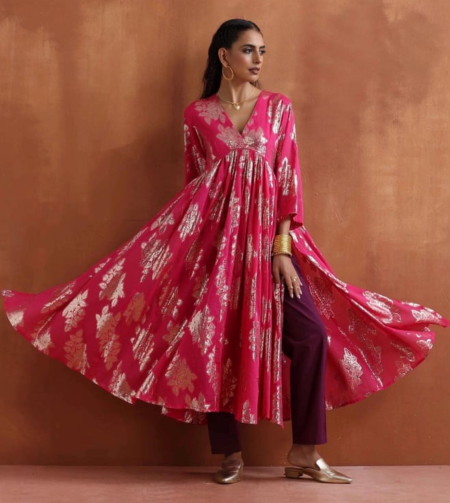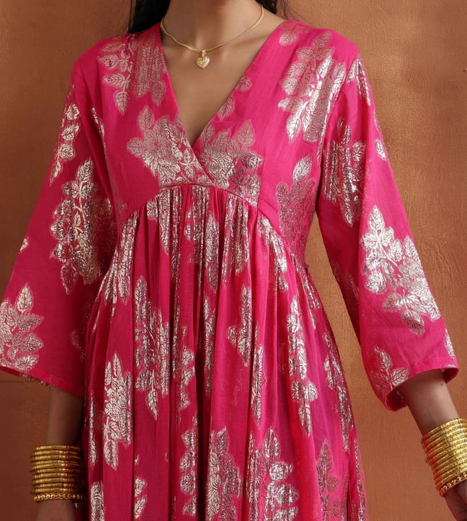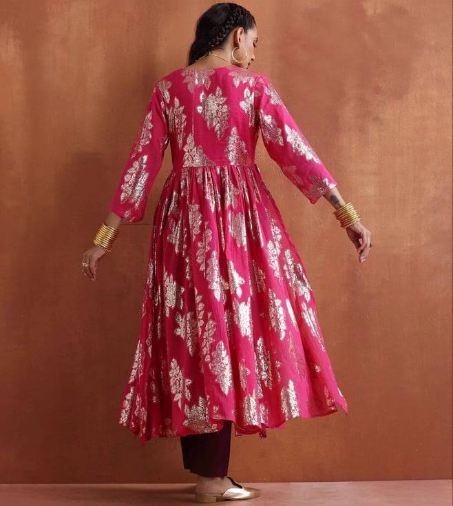 TrueBrowns Pink Phoolmandi Metallic Flared Anarkali Kurta Set