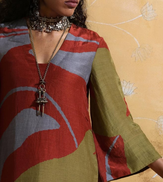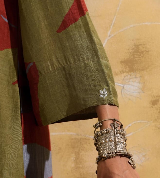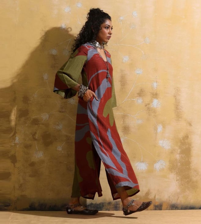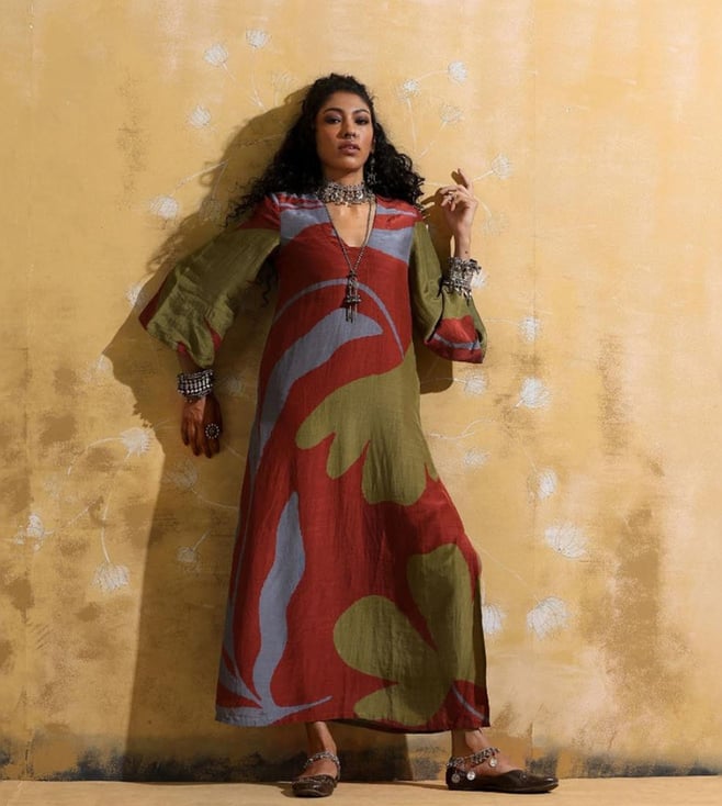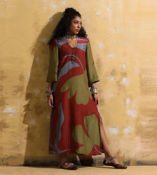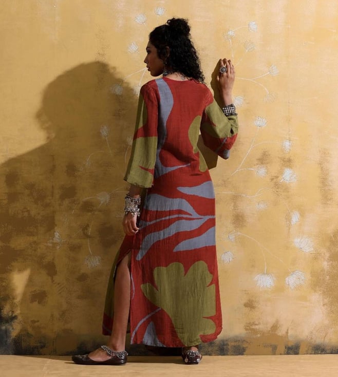 Model height is 5.6ft and is wearing XS size. Elevate your style and step into effortless elegance with this rust and green floral print dress, designed for modern style and comfort, perfect for occasions and gatherings Fabric: Muslin Silk. Dress length: 52 Straight fit dress. Glass neckline. Three-fourth sleeves. Dress has slit on both side which provides ease of movement and a stylish, flattering fit. Slip-on dress for effortless wear. Dress Pockets: 2. Dress is fully lined, ensuring a secure and comfortable fit, giving you confidence all day long. Dry clean only