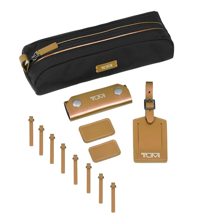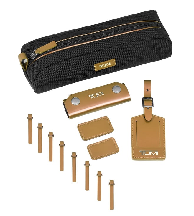 The TUMI Accents kit lets you easily customize your bag with pops of color. Add a touch of personal flair to your favorite TUMI travel or business cases while making them easy to identify. The kit includes components made from embossed leather, luggage tag, monogram patch, handle wrap and zipper pull ties. The zip pouch is ideal for carrying accessories.