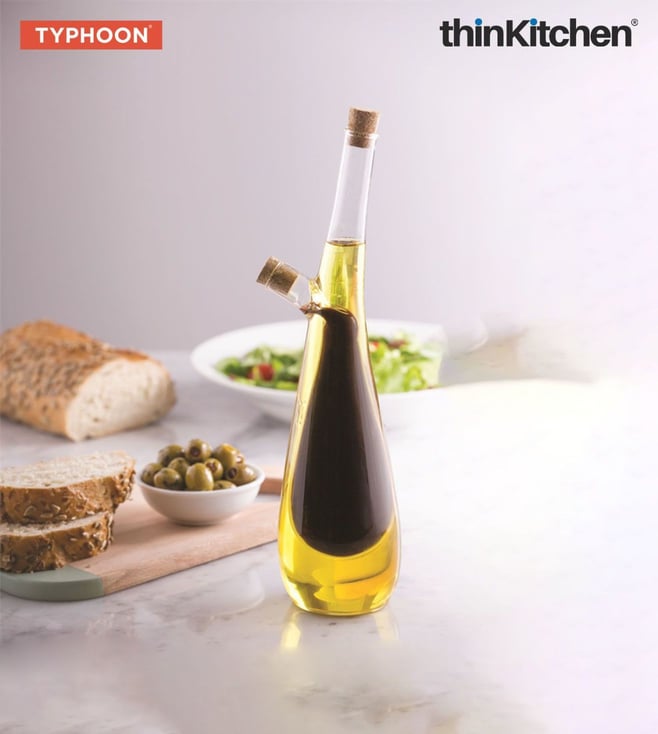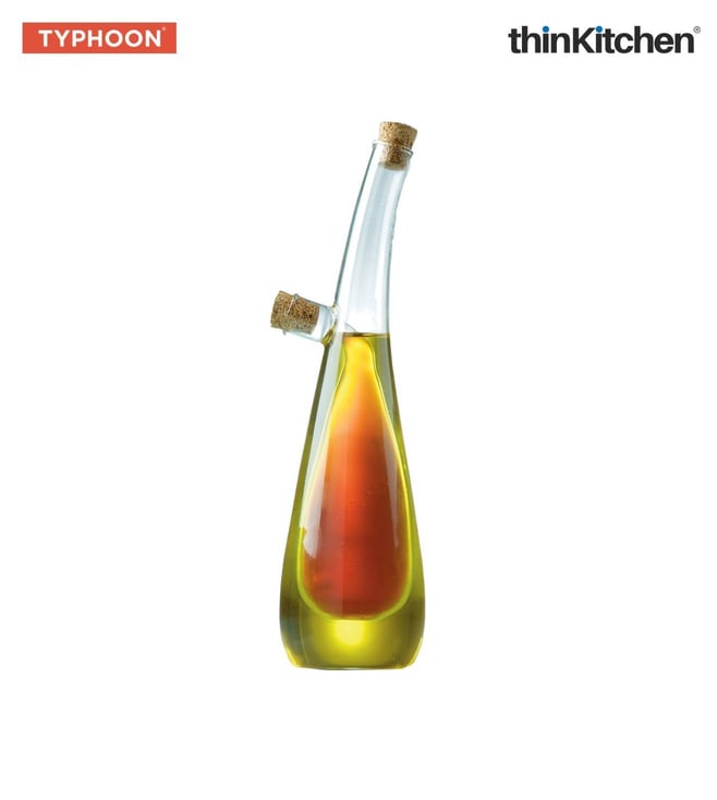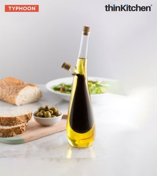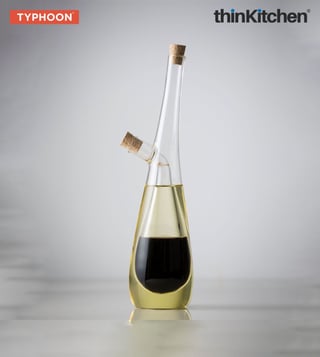 The Typhoon Tear Drop Duo Drizzler, made from durable borosilicate glass, stores oil & vinegar mess-free. Features dual compartments (100ml & 280ml) with cork stoppers to keep contents fresh.